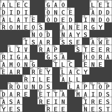 ACROSS 1. Actor Baldwin 5. E Mali city 8. Flowery wreath 11. "You Light Up My Life" star Conn 12. Single time 14. Say or write further 15. Having winglike extensions 17. Wrote a lyric poem 18. Southeast Asian peninsula 19. Lover boys 21. Disorder of the immune system 23. Lower and raise head in agreement 25. Negative votes 26. Austrian river, tributary to the Danube 27. Compass dir. 28. Deep reverence 31. 54 in ancient Rome 33. Strike 35. Navigate 37. Capital of Latvia 38. Girls' org. (abbr.) 40. Israeli folk dance 41. Amid 43. Affectionate concern, for short 45. Compass dir. 46. Ewer handle 47. Marina Del _, California 50. Made of lace 52. Cause heat under the collar 53. Everything 54. Periods in a boxing match 56. Portable computer 61. Have the gumption 62. Singer James 65. Unmarried girls 66. White ___ sheet 67. It's straight from the horse's mouth 68. Angers 69. It is so 70. To sift 71. A home for chicks DOWN 1. The sixth month of the Jewish calendar 2. _ and Stitch 3. Dutch treat 4. Quote 5. Thick or sticky substance 6. Added to 7. Seas 8. Austrian-born American filmmaker Fritz 9. Whirlpool 10. Wedding promise 13. Ferber et al. 16. Immeasurably long periods of time 18. Big collection agency 20. Fly high 22. Snake ____ (dice throw) 24. To trail on the ground 26. _ the terrible 28. Period of immesurable duration 29. Past tense of be (plural) 30. Period 31. Pale green bean 32. Russian composer Stravinsky 34. Pacific Standard Time (abbr.) 36. Those things 37. Actress Charlotte 39. Silent film actress Nazimova 42. Broad smile 44. Give a ring to 48. A person who is older than you are 49. Last 51. Dollar (slang) 52. Regret 54. Raze (variant) 55. Mouths or openings 57. Ache 58. Become fatigued 59. Lyric poems 60. Inconspicuous attention getter 61. 24 hours 63. Standoff 64. One (Scot)