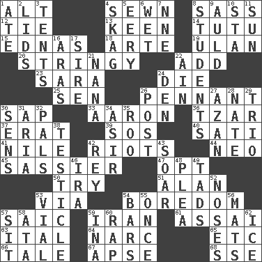 ACROSS 1. Keyboard modifier key 4. Stitched 8. Backtalk 12. Make a knot 13. Peachy ____! 14. Ballerina skirt 15. Ferber et al. 18. Johnson of "Laugh-In" 19. Uhlan (variant) 20. Slender, wiry 22. Say or write further 23. "Two Mules for Sister ____" 24. Pass on 25. Elected rep. 26. Pre-World Series prize 30. Plant excrement 33. Composer Copland 36. Czar 37. Part of Q.E.F. 39. Mayday 40. Suttee (variant) 41. Mediterranean tributary 42. Debaucheries 44. Modern: prefix 45. More impudent 47. Elect 50. Attempt 51. ____ Jay Lerner 53. By way of 54. Mood resulting from idleness 57. Ketch in the Levant 59. SW Asia republic 61. Slender Brazilian palm 63. Slanted text style (abbr.) 64. Drug cop 65. And so on (abbr.) 66. Falsehood 67. Domed church section 68. Compass dir. DOWN 1. Had dinner 2. Hats (slang) 3. Portable shelters 4. Heroin 5. Suggestive of the supernatural 6. Dripping 7. Compass dir. 8. SAT takers 9. Old (Scot.) 10. R.R. building 11. Player for Phoenix 16. Caspian sea tributary 17. Father 21. Nanny 22. The 18th letter of the Arabic alphabet 24. Lair 26. Mail 27. Muslim summons to prayer 28. Nathan's nickname 29. Musical group of three 30. Elected reps. 31. Operatic vocal solo 32. Friends 34. SW Saudi Arabia district 35. Friend of Pooh 38. One of the two male reproductive glands 42. Marina Del _, California 43. Fly high 46. Lyricist Gershwin 48. Entreaty 49. Small boys 52. Olfactory organs 53. Small bottle 54. Drinking establishments 55. At one time in the past 56. Floor protectors 57. Be seated 58. "One Day ___ Time" 59. _ tizzy (2 wds.) 60. Strike 62. Frozen water