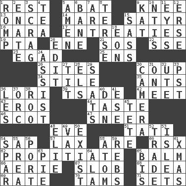 ACROSS 1. Repose 5. Blind as ____ 9. Leg joint 13. Single time 14. Female horse 15. Man with strong sexual desires 16. Hindu Mythology: god of death 17. Pleas 19. Parent Teacher Assoc. 20. Compass dir. 21. Mayday 22. Compass dir. 23. Mild oath 25. Followers of ems 26. Locates 30. Clever action or accomplishment 34. Vertical member of a panel or frame 35. Pismires 36. Australian parrot (variant) 39. Sadhe (variant) 42. Rendezvous 43. Greek god of love 44. Clothes sense 46. Highlander 47. Contemptuous expression 48. Night before a holiday 51. Jacques of French films 54. Plant excrement 57. Not strict 58. "We ___ not amused" (Victoria) 60. Acura sports coupe 62. Conciliate 65. Lip ointment 66. Nest on high 67. Oscar Madison type 68. It may be bright or harebrained 69. Pace 70. Scottish caps 71. Arranges properly for use DOWN 1. Play 2. Maternal 3. Lean end of the neck 4. Beverage made from leaves 5. So be it 6. Object of repulsion 7. Nonscientific branch of learning 8. Laconic 9. Krazy ___ of comics 10. Nuclear Threat Initiatives 11. Sight organs 12. Celtic language 15. Backtalk 18. Period of immesurable duration 20. Prepare for publication 24. Aid 27. Teat (slang) 28. Raised railways 29. Theater features 30. Device for capturing images 31. Single 32. Shoshoni 33. Pacific Standard Time (abbr.) 36. French article 37. The grampus (Milton) 38. Friend of Pooh 40. Daniel's nick name 41. Compass dir. 45. False hair 48. Writer Wiesel 49. Large container 50. Be extant 52. Exchange 53. Small island 54. Coast Guard woman 55. Length times width 56. Sweet dark-red dessert wine 58. Smallest unit of an element 59. Confederate soldiers (slang) 61. Dec. holiday 63. Sliced dessert 64. In the manner of 65. Altar cloth linen