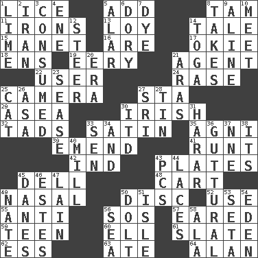ACROSS 1. Louse (plural) 5. Say or write further 8. Scottish cap 11. Removes the wrinkles 13. Myrna of the movies 14. Falsehood 15. French painter Edouard 16. "We ___ not amused" (Victoria) 17. Migrant worker of the '30s 18. Followers of ems 19. Suggestive of the supernatural 21. Representative 22. One who makes use of a thing 24. Raze (variant) 25. Device for capturing images 27. R.R. building 29. At sea 30. From or relating to Ireland 32. Small amounts or degrees 33. Smooth fabric 35. Hindu god of fire 39. Make improvements or corrections to 41. Undersized animal 42. Indiana (abbr.) 43. Food holders 45. Small valley 48. Haul 49. Rhinal 50. Plate 52. Purpose 55. Opposed to 56. Distress signal 57. Having ears or earlike features 59. Adolescent 60. Pipe bend 61. Schedule 62. Double-curved letter 63. Had dinner 64. ____ Jay Lerner DOWN 1. Welles in "The Third Man" 2. SW Asia republic 3. Ingested 4. Compass dir. 5. Having or resembling wings 6. Small, narrow, flatbottom fishing boat 7. Color 8. Proceeds 9. Place in a line 10. Rendezvous 12. Bull 14. Ancient Roman robe 20. Period 21. Ancient river in northeast Turkey 23. Gospel singer Marvin 25. Feline 26. White ___ sheet 27. _ Lanka 28. Shallow baking pan 30. It would 31. Ethiopian city, capital of Harari 33. Elected rep. 34. Added to 36. From the throat 37. Compass dir. 38. ___ a Wonderful Life 40. Place where flour is made 43. Personal Computers (abbr.) 44. Shoestrings 45. Natives or inhabitants of Denmark 46. _____ Park, CO 47. (Had) reclined 49. Nathan's nickname 50. Stupid person 51. Capri or Wright 53. Bristle 54. Genesis locale 56. Ocean 58. Wing