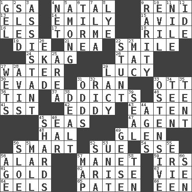 ACROSS 1. Girls' org. (abbr.) 4. Relating to or accompanying birth 9. Painter Guido (1575-1642) 13. Raised railways 14. Poet Dickinson 15. Enthusiastic 16. French article 17. Singer Mel 18. Cause heat under the collar 19. Expire 21. Teachers' org. 22. Grin 24. Heroin 26. Make lace 27. Wetness 29. "I Love _" 30. Dodge 31. Northwest Algerian city 33. Baseball player Mel 36. Shallow baking pan 37. Inveterate users 40. Perceive with the eye 41. Fast jet (abbr.) 42. Whirlpool 43. Eroded 45. Oceans 47. Rep 48. Actor Linden 49. Small, secluded valley 50. Don Adams' spy role 52. Institute legal proceedings 54. Compass dir. 56. Having or resembling wings 57. French painter Edouard 59. Big collection agency 61. Gilded 62. Originate 63. Compete 64. Snakelike fish 65. Eucharist need 66. Car or cant ending DOWN 1. Set 2. Downhill vehicle 3. Aide 4. Fish or hair follower 5. Amid 6. Become fatigued 7. _ mater 8. Sodium hydroxide 9. Noteworthy scarcity 10. Morally bad or wrong 11. Mediterranean tributary 12. Binary compound 20. Supplemented with great effort 22. Check the growth or development of 23. Big _ 25. Length times width 27. Moistens 28. Advice 29. Made of lace 31. Probability 32. To free from 33. Clearly or manifestly demonstrative 34. Adolescent 35. Portable shelter 38. Started a card game 39. Lick closed 44. Matures 45. Pottery fragments 46. Hearing organ 49. Honkers 50. _ gin 51. Shopping center 52. "Two Mules for Sister ____" 53. A single undivided whole 55. One of the Great Lakes 56. Grow older 57. Atlas unit 58. Nine, plus one 60. Elected rep.