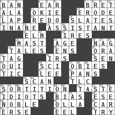 ACROSS 1. Prohibit 4. Hearing organ 7. Cy Young winner Saberhagen 11. Chicken ___ king 12. Migrant worker of the '30s 13. Eat (away) 14. Infant locale 15. Make new 16. Chalkboards 17. Lacking in sense or substance 19. Aide 21. Shade tree 23. Angers 24. Vertical spar for supporting sails 25. Ripen 26. Tired old horse 29. Falsehoods 30. Followers of ems 31. Mouth or opening 32. Label 33. Big collection agency 34. Elected rep. 35. Fr. "Yes" 36. _-fi 37. Off-Broadway awards 40. Nervous spasm 41. Area sheltered from the wind 42. Zero-star reviews 43. Examine minutely or intensely 45. Affectionate concern, for short 46. Drawing lots 51. Clothes sense 55. Foolish or stupid persons 56. Prejudice 58. Compass dir. 59. Impressive in appearance 60. Spanish pot 61. 4-wheeled motor vehicle 62. Celtic language 63. Snakelike fish 64. Attempt to accomplish something DOWN 1. Indonesian resort city 2. Actor Alda or Thicke 3. California wine valley 4. Supplement with great effort 5. Opera by Verdi 6. Vintage cars 7. Naughty children 8. Roll call or roster of names 9. Locale of original sin 10. Trial 12. Threatening words 13. Otherwise 16. Male parents of animals 18. Be tempered by heat 20. Attaches a signature 22. Mountains (abbr.) 24. Mysterious quality of enchantment 25. Nest on high 26. Olfactory organs 27. Ancient Greek god of war 28. Separate the seeds from cotton 29. "Change" in Tahitian 32. Small child 33. Ancient Celtic tribe of eastern Britain 36. Narrow boards 37. Choose 38. Greek mezzo-soprano Agnes 39. South American Indian 43. Took without asking 44. Quote 46. Trig term 47. Scent 48. Teases 49. Mitch Miller's instrument 50. The longest river in the world 52. Religious group 53. Russian ruler of old 54. Suggestive of the supernatural 57. 100%