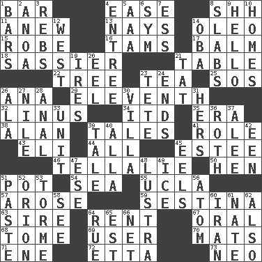ACROSS 1. Soap unit 4. Relaxation 8. Quiet! 11. Afresh 13. Negative votes 14. Margarine 15. Loose flowing garment 16. Scottish caps 17. Lip ointment 18. More impudent 21. Eating place 22. Family _ (genealogy) 23. Beverage made from leaves 25. Mayday 26. Santa ___, CA 29. Veterans Day date 32. "_ and Lucy" (Charlie Brown theme song) 34. It would 35. Period 38. Actor Alda or Thicke 39. Stories 41. Hero or heavy, e.g. 43. Biblical high priest 44. Everything 45. First name in cosmetics 46. Copy Pinocchio 50. Layer 51. Plant holder 54. Ocean 55. Southern CA. univ. 57. Came up 59. French poetic form 63. Male parent of an animal 64. Monthly bill 67. Spoken 68. Heavy book 69. One who makes use of a thing 70. Floor protectors 71. Compass dir. 72. Singer James 73. Modern: prefix DOWN 1. Drinking establishments 2. Small Philippine buffalo 3. Confederate soldiers (slang) 4. Main course 5. Auto club (abbr.) 6. Symbol (abbr.) 7. Curvy letter 8. Thick slices 9. Phone greeting 10. Residences 12. Compass direction 14. Chief or king in Benin or Nigeria 19. Angers 20. Snakelike fish 21. Make lace 23. False hair 24. Extremities 26. Insect wing 27. "Death on the ____" 28. Of or related to the anus 30. Country residence 31. Possessive pronoun 33. A single undivided whole 36. Writer of Portnoy's Complaint (1969) 37. Toward shelter 39. Story 40. Silent film actress Nazimova 42. Car or cant ending 45. Snakelike fish 47. Compass dir. 48. A period of five years 49. Frozen water 51. Thick mixture 52. Greek mythologigal hunter 53. Singer Mel 56. Tiny particle 58. Observe 60. SW Asia republic 61. Nathan's nickname 62. In addition 64. Regret 65. Eastern Standard Time (abbr.) 66. Fish or hair follower