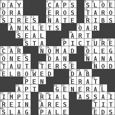 ACROSS 1. 24 hours 4. Smile enhancers 8. A type of plum 12. Mouth or opening 13. Greek god of love 14. Pacific island yam 15. Begets 18. Nathan's nickname 19. Chest bones 20. Short socks 22. Boat paddle 23. Lick closed 24. Tate display 25. R.R. building 26. Photo 30. Auto 33. Wanderer 36. Cassini of fashion 37. Washington bills 39. Daniel's nick name 40. Grandmother 41. Strained 42. Laconic 44. Dreamland 45. Shoved, as through a crowd 47. Pat or tap gently 50. Writing instrument 51. Part of Q.E.F. 53. Fitting 54. Commissioned military rank 57. Body of Kaffir warriors 59. Monetary unit of Yemen 61. Slender Brazilian palm 63. It's straight from the horse's mouth 64. Ancient Greek god of war 65. Teat (slang) 66. Volcanic refuse 67. Diluted with white 68. Begley and Asner DOWN 1. Two (Sp.) 2. Roberta Peters solo 3. Entertaining tales 4. Penny 5. Caspian sea tributary 6. Cooking vessel 7. Compass dir. 8. Ski resort town in Vermont 9. Den 10. Globe 11. Greek goddess of the dawn 16. Makes supply last 17. Narrow board 21. Liveliness 22. The grampus (Milton) 24. Help 26. Zero-star reviews 27. ____ Bator, Mongolia 28. Western Nevada city 29. Mild oath 30. ____ d'Azur (French Riviera) 31. Of or related to the anus 32. Reuben's nickname 34. Wrote a lyric poem 35. Third mo. 38. Ceasing 42. "___ Little Indians" 43. Paradise 46. Soggy 48. Length times width 49. Soap units 52. Clothes sense 53. Capital of Western Samoa 54. Highlander 55. Otherwise 56. Put down 57. Big collection agency 58. Cartoonist voice _ Blanc 59. Hit sharply and swiftly 60. Lyricist Gershwin 62. ___ a Wonderful Life