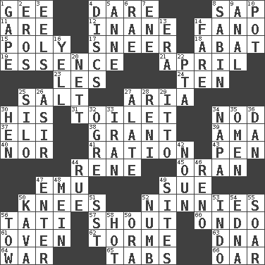 ACROSS 1. Unit of force equal to gravity 4. Have the gumption 8. Plant excrement 11. "We ___ not amused" (Victoria) 12. Empty; void 14. Papal veil 15. More than one (prefix) 17. Contemptuous expression 18. Blind as ____ 19. Substance 21. Showery time 23. French article 24. "___ Little Indians" 25. Table seasoning 27. Roberta Peters solo 30. Part of HMS, perhaps 31. Bathroom 34. Allow head to fall sleepily 37. Biblical high priest 38. Monetary aid 39. Nanny (var.) 40. And not 41. Food allowance for one day 43. Fenced enclosure 44. French philosopher Descartes 45. NW Algerian seaport 47. Australian flightless bird 49. Take to court 50. Leg joints 52. Simpletons 56. Jacques of French films 57. Yell 60. Southwest Nigerian state 61. Baking chamber 62. Singer Mel 63. Heredity factor (abbr.) 64. Armed conflict 65. Bar bills 66. Boat paddle DOWN 1. Stare wonderingly 2. Greek god of love 3. Snakelike fish 4. Plates 5. Queen of England 1702-14 6. Actress Charlotte 7. Compass dir. 8. Unit of acoustic absorption 9. Of or related to the anus 10. Plant holder 13. Epoch 14. Conductor's collection 16. Shout 20. Remaining after all deductions 22. Parent Teacher Association (abbr.) 25. Grain storage tower 26. SW Saudi Arabia district 27. Having winglike extensions 28. Painter Guido (1575-1642) 29. "Tell ____ the Marines!" 30. Layer 32. Legendary monster 33. SW Asia republic 34. California wine valley 35. Presage 36. One of the 12 tribes of Israel 42. Part of speech 44. Sorrow 46. Former U.S. Attorney General Janet 47. Keyboard key 48. Chow _ 49. Settings 50. Polynesian shrub of the pepper family 51. Fast jet (abbr.) 52. Unfeeling 53. _ china 54. Pulitzer Prize-winning author Ferber 55. Fly high 56. Pull behind 58. Being at a high temperature 59. Mouth or opening