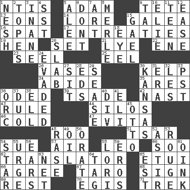 ACROSS 1. Nuclear Threat Initiatives 5. First of billions? 9. False hair 13. Immeasurably long periods of time 14. Old wives' tales, e.g. 15. An organ shaped like a helmet 16. Argument over a trivial matter 17. Pleas 19. Layer 20. Arrange properly for use 21. Potassium hydroxide 22. Compass dir. 23. Stitch closed the eyes of (a falcon) 25. Snakelike fish 26. Flower holders 30. Seaweed 34. Remain 35. Ancient Greek god of war 36. Wrote a lyric poem 39. Sadhe (variant) 42. Political cartoonist Thomas 43. General guideline 44. Grain storage towers 46. Having a low temperature 47. Webber/Rice musical 48. Friend of Pooh 51. Russian ruler of old 54. Institute legal proceedings 57. Atmosphere 58. Lion 60. "Barney Miller" actor Jack 62. Interpreter 65. Needle case 66. Match 67. Edible starchy tuberous root 68. Public display of a written message 69. Take ten 70. The front part of a cuirass 71. Long journey DOWN 1. Delicate 2. Drinks excessively 3. Empty; void 4. Fast jet (abbr.) 5. Toward shelter 6. Do not 7. Nonscientific branch of learning 8. Haggard of country music 9. Make lace 10. Writer Wiesel 11. Adolescent 12. Relaxation 15. Highlander 18. Sight organ 20. Broad, flat, thick piece 24. Eluded 27. Be seated 28. Begley and Asner 29. Gospel singer Marvin 30. Sunflower state 31. Epoch 32. French article 33. Pacific Standard Time (abbr.) 36. The grampus (Milton) 37. Superhero pair 38. Pipe bend 40. HTML Container Element 41. Connecticut Ivy Leaguer 45. Von Bismarck 48. To erase 49. Petroleum 50. Declaim 52. Moving about 53. Makeup applied to the cheeks 54. Play the lead 55. Goad 56. Hearing organs 58. Australian parrot (variant) 59. Greek god of love 61. Pig sound 63. Fish or hair follower 64. Label 65. Eastern Standard Time (abbr.)