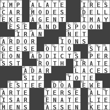 ACROSS 1. Naughty child 4. Having winglike extensions 9. Angers 13. 4-wheeled motor vehicle 14. Methods 15. Small valley 16. Supplement with great effort 17. Rep 18. "If ____ say so..." 19. Compass dir. 21. Plus 22. Soup utensil 24. SW Asia republic 26. Fish or hair follower 27. Zeal 29. Charged particles 30. Honkers 31. Von Bismarck 33. R.R. building 36. A really long time 37. Inveterate users 40. For each 41. Fast jet (abbr.) 42. Writer of Portnoy's Complaint (1969) 43. Feeling or showing extreme anger 45. The sixth month of the Jewish calendar 47. Shoestrings 48. Small drink 49. Carry 50. First name in cosmetics 52. ___ good deed 54. She-sheep 56. Johnson of "Laugh-In" 57. Laconic 59. The first octave above the treble staff 61. Austrian river, tributary to the Danube 62. Related on the mother's side 63. Whopper 64. Not women's 65. NE Netherlands city 66. A weed DOWN 1. Frozen water 2. Cause to be 3. Elected leader of a country 4. Nursemaid (var.) 5. Utah city north of Ogden 6. Arabian gulf 7. Look after 8. Eastern Standard Time (abbr.) 9. Foolish or stupid persons 10. San ____ (Riviera town) 11. Style 12. Stealthy 20. Greek god of love 22. Snout, nose 23. Animal enclosure 25. Type of rug 27. Ripens 28. Vintage cars 29. Hankering 31. Aroma 32. Teat (slang) 33. High altitude stroll 34. False hair 35. Ancient Greek god of war 38. Window treatment 39. Grain storage tower 44. Pace 45. Michaelmas daisies 46. Expire 49. Clothes sense 50. Celtic language 51. Comedian Laurel of Laurel & Hardy 52. Lairs 53. Mouths or openings 55. Writer Wiesel 56. Direct toward a target or goal 57. Afternoon social gathering 58. Car or cant ending 60. John Ritter's dad