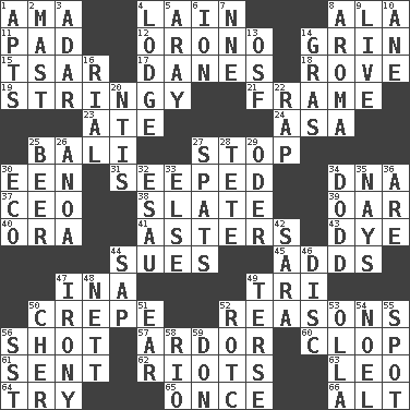 ACROSS 1. Housemaid (var.) 4. (Had) reclined 8. Wing 11. Groovy apt. 12. U. of Maine site 14. Smile widely 15. Russian ruler of old 17. Natives or inhabitants of Denmark 18. Be footloose 19. Slender, wiry 21. Movie unit 23. Had dinner 24. White ___ sheet 25. Indonesian resort city 27. Halt 30. Car or cant ending 31. Oozed 34. Heredity factor (abbr.) 37. Corporate head (abbr.) 38. Chalkboard 39. Rowing implement 40. Mouth or opening 41. Michaelmas daisies 43. Color 44. Takes to court 45. Sums up 47. _ tizzy (2 wds.) 49. Three (prefix) 50. Streamer paper 52. Thinks logically 56. Attempt 57. Zeal 60. Hoof sound 61. Emitted 62. Debaucheries 63. Lion 64. Attempt to accomplish something 65. At one time in the past 66. The first octave above the treble staff DOWN 1. Flats, for short 2. Vertical spar for supporting sails 3. The sixth month of the Jewish calendar 4. Cabin 5. Like ___ of sunshine 6. Electrically charged atom 7. Compass dir. 8. Scent 9. Moving, as bait 10. A saturated hydrocarbon 13. Order of Saint Francis (abbr.) 14. Pate de foie ____ 16. Monetary unit of Yemen 20. Nuclear Threat Initiatives 22. Hit sharply and swiftly 25. Fermented drink made from hops 26. Small Philippine buffalo 27. Arguments over trivial matters 28. Wig 29. Baltic tributary 30. Environmental prefix 32. He sold his birthright 33. Otherwise 34. Texas town _ City 35. Negative votes 36. "We ___ not amused" (Victoria) 42. "Two Mules for Sister ____" 44. Plant excrement 46. Compact _ 47. Literary sarcasm 48. Remaining after all deductions 49. Laconic 50. "Mermaids" star 51. Ewer handle 52. College mil. group 53. Water jar 54. Christmas carol 55. Blemish 56. Fast jet (abbr.) 58. _ de Janeiro 59. Spanish title