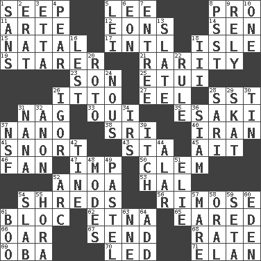ACROSS 1. Ooze 5. Area sheltered from the wind 8. Adept person 11. Johnson of "Laugh-In" 12. Immeasurably long periods of time 14. Elected rep. 15. Relating to or accompanying birth 17. International (abbr.) 18. Capri or Wright 19. A viewer who gazes fixedly 21. Noteworthy scarcity 23. Male offspring 25. Needle case 26. "Tell ____ the Marines!" 27. Snakelike fish 28. Fast jet (abbr.) 31. Tired old horse 33. Fr. "Yes" 35. 1973 Nobel Price Winner (Physics) Leo 37. Billionth: prefix 38. Indian title of respect (Mr.) 40. SW Asia republic 41. Derisive sound 43. R.R. building 45. Small island 46. Avid follower 47. Naughty child 50. Clement's nick name 52. Small Philippine buffalo 53. Actor Linden 54. Tears up 56. Full of chinks, cracks, or crevices 61. Alliance 62. Inactive volcano in Sicily 65. Having ears or earlike features 66. Boat paddle 67. Post 68. Assign a rank or rating to 69. Chief or king in Benin or Nigeria 70. Directed 71. Liveliness DOWN 1. Without 2. Part of Q.E.F. 3. Singer James 4. Lightbulb-shaped fruit 5. Flowery wreath 6. Period of immesurable duration 7. Main course 8. Inconspicuous attention getter 9. Trust 10. Single 13. Schedule 16. For fear that 18. One more than two 20. Printing process, for short 22. General guideline 24. Good sense 26. Composer Stravinsky 28. Indian skirt 29. Three-handed card game 30. Metal container 31. Nanny 32. At once, immediately (arch.) 34. Big collection agency 36. Thailand, formerly 37. Science/research agcy. 39. Hankering 42. Prong on a fork 44. Having or resembling wings 48. Methods 49. Soft color 51. Writer Wiesel 52. Curve 54. Broad, flat, thick piece 55. Israeli folk dance 57. Female horse 58. Spoken 59. Bristle 60. Paradise 61. Oct. 31 cry 63. Compass dir. 64. Find the sum of