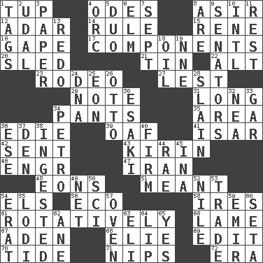 ACROSS 1. Uncastrated adult male sheep 4. Lyric poems 8. SW Saudi Arabia district 12. The sixth month of the Jewish calendar 14. General guideline 15. French philosopher Descartes 16. Stare wonderingly 17. Parts 20. Downhill vehicle 21. Shallow baking pan 22. Keyboard modifier key 23. Cowboy competition 27. For fear that 29. Make mention of 31. Having great length 34. Leg coverings 35. Length times width 36. Singer Brickell 39. Clumsy lout 41. Austrian river, tributary to the Danube 42. Posted 43. Japanese brewing company 46. Engineer (abbr.) 47. SW Asia republic 48. Immeasurably long periods of time 51. Intended 54. Raised railways 56. Environmental prefix 58. Angers 61. Producing rotation 66. Unable to walk 67. An important port of Yemen 68. Writer Wiesel 69. Prepare for publication 70. Event that recurs at intervals 71. Pinches, bites 72. Period DOWN 1. Labels 2. Hereditary estate 3. Some stationery 4. The grampus (Milton) 5. Superhero pair 6. Shade tree 7. Back-to-school mo. 8. "We ___ not amused" (Victoria) 9. Elected representatives 10. International (abbr.) 11. State of inaction 13. Do over again 18. Petroleum 19. Compass dir. 24. Heredity factor (abbr.) 25. Period of immesurable duration 26. Von Bismarck 28. Killed 30. 1973 Nobel Price Winner (Physics) Leo 32. Teachers' org. 33. Slender fish 34. Stone: prefix 36. Compass dir. 37. Lair 38. Consumed 40. Become taut 44. Actress Charlotte 45. _ tizzy (2 wds.) 49. Fish or hair follower 50. _-fi 52. Mediterranean tributary 53. Barter 54. Part of Q.E.F. 55. Farming town in central California 57. Baking chamber 59. Arab leader 60. Stalk of a moss capsule 62. A saturated hydrocarbon 63. Biblical high priest 64. Mouth edge 65. It is so