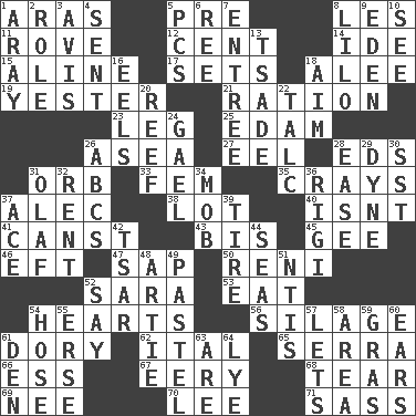 ACROSS 1. Ancient river in northeast Turkey 5. Before (prefix) 8. French article 11. Be footloose 12. Penny 14. Binary compound 15. Place in a line 17. Puts into a specified state 18. Toward shelter 19. Last 21. Food allowance for one day 23. Part of a journey 25. Dutch treat 26. Toward the sea 27. Snakelike fish 28. Begley and Asner 31. Globe 33. Opposite of masc. 35. Trading vessels 37. Actor Baldwin 38. Car dealer's back yard 40. Is not 41. 2nd pers. sing. pres. of can (arch.) 43. Again 45. Unit of force equal to gravity 46. Lizard (obsolete) 47. Plant excrement 50. Painter Guido (1575-1642) 52. "Two Mules for Sister ____" 53. Consume 54. Centers of feelings and intuitions 56. Fodder prepared in a silo 61. Small, narrow, flatbottom fishing boat 62. Slanted text style (abbr.) 65. Spanish missionary in California 66. Double-curved letter 67. Suggestive of the supernatural 68. Rend 69. Born 70. Area sheltered from the wind 71. Backtalk DOWN 1. Like ___ of sunshine 2. Hero or heavy, e.g. 3. Opinion 4. Transmitted 5. Personal Computers (abbr.) 6. To sift 7. Main course 8. _ and Stitch 9. Paradise 10. Observe 13. Sadhe (variant) 16. Snakelike fish 18. Direct toward a target or goal 20. Coral collection 22. Baby powder 24. Highlander 26. Lettered men learn these first 28. Relaxation 29. Centimeter-gram-second unit of force 30. Fast jet (abbr.) 31. Norwegian king 32. Monthly bill 34. Disorderly crowd 36. Swiss mountan, "Queen of the Mountains" 37. Adept person 39. Become fatigued 42. Russian ruler of old 44. Oceans 48. Nick name for Arthur 49. Soft color 51. Nuclear Threat Initiatives 52. Declare 54. Stockings 55. Celtic language 57. Allows 58. Type of rug 59. Pate de foie ____ 60. Hearing organs 61. Lair 63. "We ___ not amused" (Victoria) 64. Sodium hydroxide