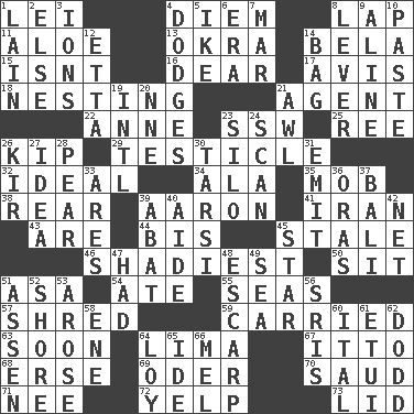 ACROSS 1. Flowery wreath 4. South Vietnam president (1954) 8. Pet locale 11. Medicinal plant 13. Gumbo ingredient 14. Actor Lugosi 15. Is not 16. Letter starter 17. Deliberation 18. Snuggling 21. Rep 22. Queen of England 1702-14 23. Compass dir. 25. To riddle 26. Sleep 29. One of the two male reproductive glands 32. Standard of perfection 34. Wing 35. Disorderly crowd 38. Posterior 39. Composer Copland 41. SW Asia republic 43. "We ___ not amused" (Victoria) 44. Again 45. Lacking originality or spontaneity 46. Most dark, concealed or hidden 50. Be seated 51. White ___ sheet 54. Had dinner 55. Oceans 57. Fragment 59. Borne 63. Within a short period 64. Pale green bean 67. "Tell ____ the Marines!" 68. Celtic language 69. Baltic tributary 70. Saudi Arabian king (1953-1964) 71. Born 72. Sharp bark 73. Hat (slang) DOWN 1. (Had) reclined 2. Otherwise 3. Charged particles 4. Evades 5. Mamie's mate 6. Period 7. Make imperfect 8. Crowbar 9. Place in a line 10. Thick mixture 12. Singer James 14. Paper or plastic container 19. International (abbr.) 20. Compass dir. 21. Leather borer 23. Grain storage tower 24. Examine minutely or intensely 26. Apertif with cassis 27. It may be bright or harebrained 28. Lightbulb-shaped fruit 30. Tarsus (plural) 31. Give off 33. Ancient Greek god of war 36. Mouths or openings 37. Indonesian resort city 39. Blind as ____ 40. Assistant 42. Fish or hair follower 45. Play the lead 47. Possessed 48. Fortification 49. Ocean 51. NE Netherlands city 52. Dinah or Pauly 53. Came up 56. Indian titles of respect 58. Compass dir. 60. Slanted text style (abbr.) 61. Needle holder 62. Texas town _ City 64. Myrna of the movies 65. Binary compound 66. Cartoonist voice _ Blanc