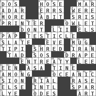 ACROSS 1. Two (Sp.) 4. Flexible conduit 8. Make imperfect 11. The sixth month of the Jewish calendar 13. Blunders 14. Past tense of be (plural) 15. Greater amount 16. "This won't hurt ____!" 17. Indian titles of respect 18. Hard copy producer 21. A small or young owl 22. Do not 23. Cards in a Roman deck? 25. Raised railways 26. Infant food 29. One of the two male reproductive glands 32. Schedule 34. Night before a holiday 35. Large cup 38. Native american tent (variation) 39. Tear up 41. SW Asia republic 43. Small amount or degree 44. Mayday 45. Window treatment 46. Plea 50. Area sheltered from the wind 51. Car or cant ending 54. White ___ sheet 55. Prong on a fork 57. Amid 59. Pertaining to the sea 63. The Jewish people; Israel 64. Monetary unit of Yemen 67. To erase 68. Otherwise 69. International (abbr.) 70. Practice fight 71. Potassium hydroxide 72. Lyric poems 73. Nonscientific branch of learning DOWN 1. Moist 2. Scent 3. Indian skirt 4. Centers 5. Globe 6. Indian title of respect (Mr.) 7. Eastern Standard Time (abbr.) 8. Haggard of country music 9. Satellite of Uranus 10. Musical pauses 12. Tear apart 14. Compass dir. 19. Carry 20. Compass dir. 21. Petroleum 23. Not recorded 24. On the rocks 26. Pacific Standard Time (abbr.) 27. Came down and settled, as after flight 28. Dad 30. Laconic 31. Arab leader 33. Event that recurs at intervals 36. Mountain range 37. Yawn 39. Fast planes 40. Israeli folk dance 42. Born 45. Unit of force 47. Tired old horse 48. Ringlike coral islands and reefs 49. Nervous spasm 51. Artist's stand 52. Poet Dickinson 53. Trap for birds or small mammals 56. Hearing organs 58. Compass dir. 60. California wine valley 61. Austrian river, tributary to the Danube 62. An absolute certainty 64. _ de Janeiro 65. Indiana (abbr.) 66. Had dinner