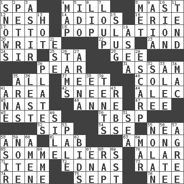 ACROSS 1. Health resort 4. Place where flour is made 8. Vertical spar for supporting sails 12. Soft 14. Goodbye (Sp.) 16. One of the Great Lakes 17. "Beetle Bailey" pooch 18. Census information 20. Compose 22. Festering 23. Also 24. Title for a knight 25. R.R. building 28. Turn to the right 30. Lightbulb-shaped fruit 31. Indian state 35. 100% 37. Rendezvous 40. Root beer relative 41. Type of rug 42. Scornful expression 44. Actor Baldwin 45. Political cartoonist Thomas 46. Singer Murray 47. Portuguese money of account (variant) 48. _____ Park, CO 50. Cook's measure (abbr.) 52. Small drink 54. Compass dir. 55. Teachers' org. 58. Santa ___, CA 61. Experiment locale 63. Amid 65. Wine waiters 70. Having or resembling wings 71. A whole individual unit 72. Ferber et al. 73. Pace 74. French philosopher Descartes 75. Back-to-school mo. 76. Born DOWN 1. Overwhelms 2. _ dish (used to culture cells) 3. Being in motion 4. Atlas unit 5. Wedding promise 6. Mouth edge 7. Central Nebraska county 8. Was introduced to 9. Operatic vocal solo 10. The Jewish people; Israel 11. Look after 13. Being at a high temperature 15. Strike heavily 19. At sea 21. Compass dir. 26. Scottish caps 27. Sports stadium 29. Fortification 30. Food holders 32. Flatfish 33. Toward shelter 34. Big _ 35. Caspian sea tributary 36. For fear that 38. Car or cant ending 39. Portable shelters 41. One (Scot) 43. Confederate soldiers (slang) 49. Drop; flow; fall 51. Ocean 53. Light colored 55. Pitcher Ryan 56. Related on the mother's side 57. Match 58. SW Saudi Arabia district 59. Make mention of 60. So be it 62. Auction offers 64. Spoil 66. Madame (abbr.) 67. Compass dir. 68. Reproach for some lapse or misdeed 69. Fast jet (abbr.)