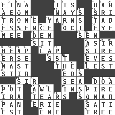 ACROSS 1. Inactive volcano in Sicily 5. It is 8. Boat paddle 11. Period of immesurable duration 12. Negative votes 14. _ Lanka 15. Marketplace scale 17. Tall tales 18. Bit 19. Gist 21. Sep. follower 22. Sight organ 23. Born 24. Lair 25. Elected rep. 27. Be seated 28. SW Saudi Arabia district 31. Pile 35. Infant locale 37. Title for a man of rank and authority 38. Celtic language 39. Fast jet (abbr.) 41. Nights before holidays 42. Political cartoonist Thomas 43. Definite Article 45. For fear that 46. Agitate 47. Begley and Asner 49. Title for a knight 51. Ocean 52. ___ good deed 55. Plant holder 57. Leather borer 60. Motivate 62. Lyricist Gershwin 63. Pulls apart 65. Echolocation 66. Baking dish 67. 4th largest of the Great Lakes 68. Suttee (variant) 69. Eastern Standard Time (abbr.) 70. Compass dir. 71. Woody plant DOWN 1. Ingested 2. Laconic 3. Trap for birds or small mammals 4. Queen of England 1702-14 5. _ tizzy (2 wds.) 6. Pacific island yam 7. Synchronize (abbr.) 8. Clearly or manifestly demonstrative 9. Like ___ of sunshine 10. Travel on an animal 13. Fast planes 16. Extremities 17. Gossips 20. To provide with a ceiling 26. Artist's stand 29. Angers 30. Respite 31. Coop moms 32. Part of Q.E.F. 33. Aide 34. _ dish (used to culture cells) 36. Pacific Standard Time (abbr.) 40. College paper 44. Paradise 48. Backtalk 50. Pace 52. Middle Eastern gold or silver currency 53. Declaim 54. Nest on high 55. Corncob 56. Mouths or openings 58. Past tense of be (plural) 59. (Had) reclined 61. Mail 64. To separate or throw off