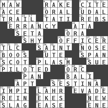 ACROSS 1. Opening into something insatiable 4. Immoral or dissolute person 8. Quote 12. Adept person 13. Relating to the mouth 14. Hereditary estate 15. Hang back 18. Jacques of French films 19. Confederate soldiers (slang) 20. Tendancy to err 22. _ moment's notice (2 wds.) 23. Stalk of a moss capsule 24. Mouth or opening 25. Like a shrinking violet 26. Person of authority 30. Affectionate concern, for short 33. Inhabitant of Heaven 36. Olfactory organ 37. Scornful sounds 39. Shoshoni 40. Connect, as a bridge 41. Native of Scotland 42. Suffix with ecto or cyto 44. Take to court 45. Manned the helm 47. The grampus (Milton) 50. Baking dish 51. Indonesian resort city 53. Fitting 54. French poetic form 57. Body of Kaffir warriors 59. Cowardly lion portrayer 61. Elude 63. It's straight from the horse's mouth 64. Makes supply last 65. ___ Haven, CT 66. Volcanic refuse 67. Comfort 68. Compass dir. DOWN 1. Floor protector 2. 43,560 square feet 3. Puts on (as clothing) 4. College mil. group 5. Like ___ of sunshine 6. Krazy ___ of comics 7. Connecticut Ivy Leaguer 8. Window treatments 9. The content of cognition 10. Keyboard key 11. Raised railways 16. Angers 17. Thin strip of wood or metal 21. Negative votes 22. Sandy's bark 24. Often (poetically) 26. Singles 27. 911 reaches them 28. Son of Isaac 29. French philosopher Descartes 30. Cook's measure (abbr.) 31. Venues 32. Calm and collected 34. Old (Scot.) 35. Call ___ day 38. Halting 42. Fenced enclosure 43. Crowds into 46. Make lace 48. Assign a rank or rating to 49. 154 in Roman numerals 52. Silly 53. Capital of Western Samoa 54. "______ My Girl" (Turtles hit) 55. Celtic language 56. An important port of Yemen 57. Big collection agency 58. Cartoonist voice _ Blanc 59. Area sheltered from the wind 60. Alias (abbr.) 62. She-sheep