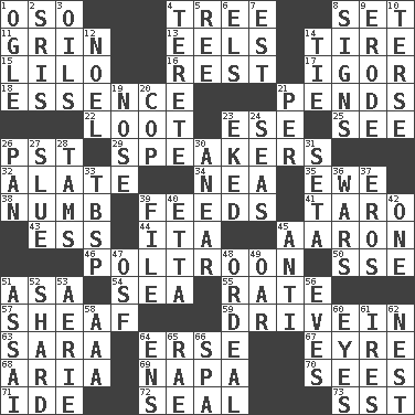 ACROSS 1. Bear (Spanish) 4. Relationship diagram 8. Put into a specified state 11. Broad smile 13. Snakelike fish 14. Hoop that covers a wheel 15. _ and Stitch 16. Repose 17. Russian composer Stravinsky 18. Core 21. Depends 22. Plunder 23. Compass dir. 25. Perceive with the eye 26. Pacific Standard Time (abbr.) 29. Orators 32. Having winglike extensions 34. Teachers' org. 35. She-sheep 38. Unfeeling 39. Eats 41. Edible starchy tuberous root 43. Double-curved letter 44. Call ___ day 45. Composer Copland 46. Characterized by complete cowardliness 50. Compass dir. 51. White ___ sheet 54. Ocean 55. Pace 57. Bundle of cut stalks of grain 59. Popular '50s hangout 63. "Two Mules for Sister ____" 64. Celtic language 67. Jane of fiction 68. Roberta Peters solo 69. California wine valley 70. Perceives with the eye 71. Binary compound 72. Lick closed 73. Fast jet (abbr.) DOWN 1. Stare 2. Indian titles of respect 3. Lubricates 4. Cylindrical with tapered ends 5. To separate or throw off 6. Raised railways 7. Eastern Standard Time (abbr.) 8. Public displays of written messages 9. Wear away 10. Laconic 12. Christmas carol 14. Neckwear 19. Sense of smell 20. Police officer (slang) 21. For each 23. Supplemented with great effort 24. Oceans 26. Baking dish 27. Change direction abruptly 28. Scottish caps 30. Approach 31. Stalk of a moss capsule 33. Cook's measure (abbr.) 36. Armed conflicts 37. Greek god of love 39. Do some clerical work 40. Singer James 42. Single 45. Against 47. Order of Saint Francis (abbr.) 48. Severe or trying experience 49. Boat paddle 51. Slender Brazilian palm 52. Broken piece 53. Nest on high 56. Nights before holidays 58. American Automobile Association (abbr.) 60. Snake ____ (dice throw) 61. Angers 62. Egg locale 64. Followers of ems 65. Actress Charlotte 66. Health resort