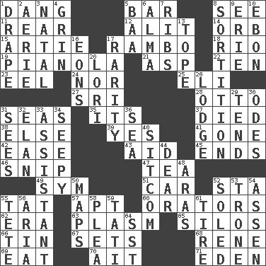 ACROSS 1. Mild oath, euphamism for damn 5. Oblong piece of solid material 8. Observe 11. Stern 12. Set down 14. Globe 15. Nick name for Arthur 17. Role for Stallone 18. _ de Janeiro 19. Player piano 21. Cleo's killer 22. "___ Little Indians" 23. Snakelike fish 24. Not either 25. Connecticut Ivy Leaguer 27. Indian title of respect (Mr.) 28. "Beetle Bailey" pooch 31. Oceans 35. It is 37. Passed on 38. Otherwise 39. Consenting reply 41. Went 42. Comfort 43. Help 45. Conclusions 46. Sever or remove by pinching or nipping 47. Afternoon social gathering 49. Symbol (abbr.) 51. Automobile 52. R.R. building 55. Make lace 57. Fitting 60. Speakers 62. Period 63. Suffix with ecto or cyto 65. Grain storage towers 66. Shallow baking pan 67. Arranges properly for use 68. French philosopher Descartes 69. Erode 70. Small island 71. Locale of original sin DOWN 1. Window treatment 2. Nest on high 3. Relating to or accompanying birth 4. Broad smile 5. Sound made by sheep 6. _ mater 7. Chest bones 8. Drawing lots 9. 4th largest of the Great Lakes 10. Inky black, to poets 13. Drink excessively 16. Immeasurably long periods of time 17. Noteworthy scarcity 20. Australian parrot (variant) 26. Inn 29. Watch over 30. Lyric poems 31. Observes 32. Flair 33. Aide 34. Oozy 36. Ocean 40. "Cheers" or "Ellen" 44. Letter starter 48. Caspian sea tributary 50. Atlas contents 52. Having a sole or soles 53. Marketplace scale 54. NE Netherlands city 55. Wig 56. Roberta Peters solo 58. Entreaty 59. Jacques of French films 61. Become fatigued 64. Fast jet (abbr.)