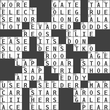 ACROSS 1. Had on 5. Yard entry 9. Make lace 12. Voters do this 14. Cassini of fashion 15. Regret 16. Sir (Sp.) 17. Having great length 18. Wing 19. Small child 20. Dodged 23. Probability 24. Vintage cars 25. Writer Wiesel 27. Relaxation 30. It is 32. Spanish title 33. _ gin 34. Hiding places for outlaws 36. Ring climax 38. Biblical high priest 39. Friend of Pooh 40. Mature 43. Infant locale 46. Fly high 48. Portico 49. Plant excrement 51. Three (prefix) 52. Son of Odin 53. Opera by Verdi 54. Whirlpool 56. One who uses or employs something 58. Sowing specialist 61. Make imperfect 64. 4-wheeled motor vehicle 65. Play the lead 66. Came up 68. Cards in a Roman deck? 69. Possessive pronoun 70. An organ shaped like a helmet 71. Adept person 72. Otherwise 73. Lightbulb-shaped fruit DOWN 1. Compass direction 2. Butter sub 3. Monthly bill 4. Environmental prefix 5. Gilded 6. _ vera 7. Looked after 8. Oval reproductive body of a fowl 9. Buy and sell 10. Old (Scot.) 11. Afternoon social gatherings 13. Relationship diagram 21. Empty area or space 22. Michaelmas daisies 23. Pig sound 24. To riddle 26. Car dealer's back yard 27. Compass dir. 28. 100% 29. Land 31. Snout, nose 35. Flew 37. Pledge 41. Thick or sticky substance 42. Ewer handle 44. SW Saudi Arabia district 45. Groovy apt. 47. Travel on an animal 48. Filthy place 50. Soft color 53. Nest on high 55. To be drawn or hauled along 56. Southern CA. univ. 57. Ketch in the Levant 59. Hearing organs 60. Celtic language 61. Undercover agent 62. Toward the sea 63. Bring up, as a child 65. A female animal or person 67. Strike