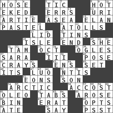 ACROSS 1. Flexible conduit 5. Nervous spasm 8. Being at a high temperature 11. Made supply last 12. Blunders 14. RI univ. 15. Nick name for Arthur 17. At sea 18. Style 19. Soft color 21. Ringlike coral islands and reefs 23. Flaplike covering 25. Airtight sealed metal containers 26. Capri or Wright 27. Conclusion 28. A female animal or person 31. Scottish cap 33. Sep. follower 35. Stares at amorously 37. "Two Mules for Sister ____" 38. One more than two 40. Airs 41. Trading vessels 43. Followers of ems 45. Arrange properly for use 46. ___ a Wonderful Life 47. Nilotic language 50. Nuclear Threat Initiatives 52. Immeasurably long periods of time 53. Boy, to dad 54. Northern region 56. Buttonhole 61. Margarine 62. Bar bills 65. Came up 66. Storage container 67. Part of Q.E.F. 68. Chooses 69. Had dinner 70. Declare 71. Inconspicuous attention getter DOWN 1. Pile 2. Gumbo ingredient 3. Arranges properly for use 4. Prepare for publication 5. Beverage made from leaves 6. Big collection agency 7. Cause to be 8. Frame or body of a ship 9. Mouths or openings 10. Metal container 13. Smooth fabric 16. Snakelike fish 18. Raised railways 20. _ and Stitch 22. Southwest Nigerian state 24. Tenth: prefix 26. "If ____ say so..." 28. A type of plum 29. Command 30. Compass dir. 31. Small pie 32. Ancient river in northeast Turkey 34. Standoff 36. Global Positioning Systems (abbr.) 37. _-fi 39. Restaurants 42. Slit 44. Portico 48. Join together 49. Motion picture awards 51. South American Indian 52. Environmental prefix 54. Set down 55. French philosopher Descartes 57. Riding implement 58. I made a mistake 59. Fast planes 60. Trial 61. Chief or king in Benin or Nigeria 63. Sound made by sheep 64. Filthy place
