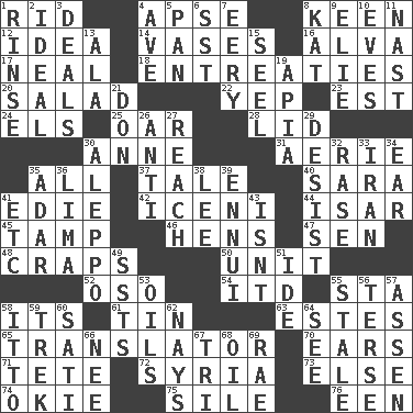 ACROSS 1. To free from 4. Domed church section 8. Peachy ____! 12. It may be bright or harebrained 14. Flower holders 16. Inventor's middle name 17. Anneal 18. Pleas 20. First course 22. Slangy assent 23. Eastern Standard Time (abbr.) 24. Raised railways 25. Boat paddle 28. Hat (slang) 30. Queen of England 1702-14 31. Nest on high 35. 100% 37. Falsehood 40. "Two Mules for Sister ____" 41. Singer Brickell 42. Ancient Celtic tribe of eastern Britain 44. Austrian river, tributary to the Danube 45. Pack (down) 46. Coop moms 47. Elected rep. 48. Dice game 50. A single undivided whole 52. Bear (Spanish) 54. It would 55. R.R. building 58. It is 61. Metal container 63. _____ Park, CO 65. Interpreter 70. Hearing organs 71. Wig 72. Damascus' land 73. Otherwise 74. Migrant worker of the '30s 75. Drop; flow; fall 76. Car or cant ending DOWN 1. Remove soap 2. Standard of perfection 3. Allots cards 4. "___ Maria" 5. Baking dish 6. Fast jet (abbr.) 7. Suggestive of the supernatural 8. Krazy ___ of comics 9. Writer Wiesel 10. Nights before holidays 11. Political cartoonist Thomas 13. Insect wing 15. Sew up the eyelids of hawks and falcons 19. Capital of Western Samoa 21. Spanish title 26. Against 27. Arrive at 29. Cease 30. City in Syria 32. Raze (variant) 33. SW Asia republic 34. Hearing organ 35. The sixth month of the Jewish calendar 36. Pale green bean 38. Area sheltered from the wind 39. World-weariness 41. And so on (abbr.) 43. Is not 49. Fast planes 51. Binary compound 53. Lubricates 55. Showing deterioration from age 56. Laconic 57. NE Netherlands city 58. "Tell ____ the Marines!" 59. Long journey 60. Suttee (variant) 62. Negative votes 64. Observe 66. Born 67. Three (prefix) 68. Lubricate 69. Actress Charlotte