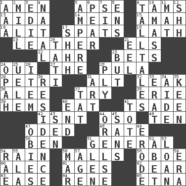 ACROSS 1. So be it 5. Domed church section 9. Scottish caps 13. Opera by Verdi 14. Chow _ 15. Housemaid 16. Came down and settled, as after flight 17. Arguments over trivial matters 18. Thin strip of wood or metal 19. Cordwainer's material 21. Raised railways 22. Cowardly lion portrayer 23. Antes 24. Fr. "Yes" 27. Definite Article 28. Monetary unit of Botswana 29. _ dish (used to culture cells) 31. Keyboard modifier key 32. Path through which fluid escapes 36. Toward shelter 37. Attempt to accomplish something 38. 4th largest of the Great Lakes 39. Folds over and sews together 40. Consume 41. Sadhe (variant) 42. Is not 44. Bear (Spanish) 46. Nine, plus one 47. Wrote a lyric poem 48. Pace 50. Benjamin's nick name 51. Commissioned military rank 54. Precipitation 56. Shopping centers 58. Mitch Miller's instrument 60. Actor Baldwin 61. Grows older 62. Letter starter 63. Comfort 64. French philosopher Descartes 65. Inactive volcano in Sicily DOWN 1. Auto club (abbr.) 2. Place where flour is made 3. Singer Brickell 4. Relating to or accompanying birth 5. Electrical Unit 6. Lightbulb-shaped fruit 7. Be seated 8. Followers of ems 9. Baron Munchausen's specialties 10. Collect or gather 11. Floor protector 12. Quiet! 17. Quiet! 20. Jacques of French films 21. Snakelike fish 23. With the exception that 24. Brightly colored fish 25. Ubangi River tributary 26. A whole individual unit 28. Apply oneself diligently 30. Dwelling 31. Nonscientific branch of learning 33. Part of Q.E.F. 34. Assistant 35. Peachy ____! 37. Make lace 40. Conclude 41. Carry 43. Elected rep. 44. Threatening words 45. Without 47. Off-Broadway awards 49. Eat (away) 51. Small, secluded valley 52. Collude with 53. Grant temporary use of 54. Actress Charlotte 55. Wing 56. Make imperfect 57. Personal question 59. Period
