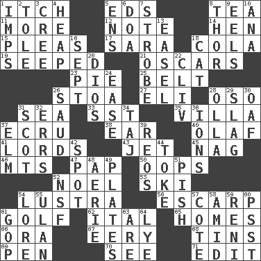 ACROSS 1. Hankering 5. Begley and Asner 8. Beverage made from leaves 11. Greater amount 12. Short letter 14. Layer 15. Entreaties 17. "Two Mules for Sister ____" 18. Root beer relative 19. Oozed 21. Motion picture awards 23. Sliced dessert 25. Waist strap 26. Portico 27. Connecticut Ivy Leaguer 28. Bear (Spanish) 31. Ocean 33. Fast jet (abbr.) 35. Country residence 37. Shade of tan 38. Ewer handle 40. Norwegian king 41. Domineers 43. _ stream 45. Tired old horse 46. Mountains (abbr.) 47. Infant food 50. I made a mistake 52. Christmas carol 53. What Jean-Claude Killy likes to do 54. A period of five years 56. Fortification 61. Eighteen holes 62. Slanted text style (abbr.) 65. Dwellings 66. Mouth or opening 67. Suggestive of the supernatural 68. Metal containers 69. Fenced enclosure 70. Perceive with the eye 71. Prepare for publication DOWN 1. Naughty children 2. Lacquered or enameled metalware 3. Algonquian 4. Pile 5. Followers of ems 6. ___ good deed 7. Disco prop 8. Son of Odin 9. Snakelike fish 10. Santa ___, CA 13. Artist's stand 16. Back-to-school mo. 18. Feline 20. "Vaya con ____" 22. 154 in Roman numerals 24. Comfort 26. Saudi Arabian king (1953-1964) 28. Spanish pot 29. Volcanic refuse 30. Clumsy lout 31. Highlander 32. Blunders 34. _ Mahal 36. Charged particles 37. Shade tree 39. Vintage cars 42. Specific locale 44. Casino tip 48. Nest on high 49. Food holders 51. Expression of disdain 52. Overdraft (abbr.) 54. Old wives' tales, e.g. 55. ____ Bator 57. ____ d'Azur (French Riviera) 58. Among 59. Painter Guido (1575-1642) 60. Inconspicuous attention getter 61. Grand Old Party 63. "We ___ not amused" (Victoria) 64. Potassium hydroxide