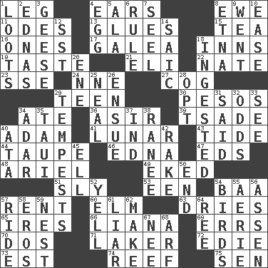 ACROSS 1. Part of a journey 4. Hearing organs 8. She-sheep 11. Lyric poems 13. Adhesives 15. Beverage made from leaves 16. Washington bills 17. An organ shaped like a helmet 18. Lodging establishments 19. Clothes sense 21. Biblical high priest 22. Nathan's nickname 23. Compass dir. 24. Compass dir. 27. Gear tooth 29. Adolescent 30. Mexican monetary units 34. Had dinner 36. SW Saudi Arabia district 39. Sadhe (variant) 40. First of billions? 41. Type of eclipse 43. Event that recurs at intervals 44. Grayish beige 46. Pulitzer Prize-winning author Ferber 47. Begley and Asner 48. Satellite of Uranus 49. Supplemented with great effort 51. Cunning 53. Car or cant ending 54. Sound made by sheep 57. Monthly bill 60. Shade tree 63. Frees from moisture 65. Angers 66. Woody, climbing, usually tropical plant 69. Blunders 70. Two (Sp.) 71. Member of a famous L.A. basketball team 72. Singer Brickell 73. Eastern Standard Time (abbr.) 74. Coral collection 75. Elected rep. DOWN 1. Plunders 2. Ferber et al. 3. Honkers 4. Ovum 5. Insect wing 6. Governing power 7. Sew up the eyelids of hawks and falcons 8. Inactive volcano in Sicily 9. Left 10. Comfort 12. Fast jet (abbr.) 14. Ketch in the Levant 18. Swallowed 20. Compass dir. 25. Actress Patricia 26. Follow as a consequence or result 28. Choose 29. Storms 31. Expressed in words 32. Likelihood 33. Observe 34. The sixth month of the Jewish calendar 35. "Change" in Tahitian 37. Indiana (abbr.) 38. Indian princess (variant) 40. _ moment's notice (2 wds.) 42. Libertine 45. Pipe bend 50. Conclude 52. Shout 54. Avian creatures 55. Nest on high 56. NE Netherlands city 57. Travel on an animal 58. Greek god of love 59. Egg locale 61. One who doesn't tell the truth 62. Create 64. To sift 67. Born 68. Sandy's bark