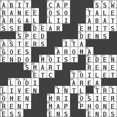 ACROSS 1. "This won't hurt ____!" 5. Head covering 8. Compass dir. 11. Indian princess (variant) 13. Bear (Spanish) 14. Falsehood 15. Therefore, facetiously 16. Cards in a Roman deck? 17. Blind as ____ 18. Compass dir. 19. Letter starter 21. Sends forth 22. Moved rapidly 24. Lairs 25. Michaelmas daisies 27. Call ___ day 29. Travels 30. Odor 32. Inside; within (prefix) 33. Damp 35. Paradise 39. Don Adams' spy role 41. French philosopher Descartes 42. And so on (abbr.) 43. Bathroom plumbing fixture 45. Farming town in central California 48. Length times width 49. Make or become more lively 50. International (abbr.) 52. Three (prefix) 55. Sign of things to come 56. Medical imaging device (abbr.) 57. Flexible twig of a willow tree 59. Monthly bill 60. Atlas unit 61. Give a jingle 62. Curvy letter 63. Followers of ems 64. Conclusions DOWN 1. Caspian sea tributary 2. Oblong pieces of solid material 3. Eaten 4. Afternoon social gathering 5. Root beer relative 6. SW Saudi Arabia district 7. Luau course 8. Unit of acoustic absorption 9. Narrow boards 10. Soaks 12. A person who is older than you are 14. Not wild 20. Begley and Asner 21. Dutch treat 23. Mexican monetary units 25. Grow older 26. Male child 27. Big collection agency 28. Small child 30. Small island 31. Nest on high 33. Floor protector 34. The grampus (Milton) 36. Accusation by an informer 37. Compass dir. 38. Fish or hair follower 40. Chow _ 43. Make lace 44. Lowest deck of a ship 45. Citrus fruits 46. Baking chambers 47. Incision 49. Old wives' tales, e.g. 50. SW Asia republic 51. Pinches, bites 53. Tear apart 54. Angers 56. Madame (abbr.) 58. A female animal or person