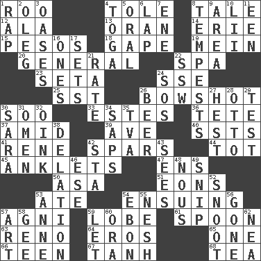 ACROSS 1. Friend of Pooh 4. Lacquered or enameled metalware 8. Lie 12. According to 13. Northwest Algerian city 14. One of the Great Lakes 15. Mexican monetary units 18. Yawn 19. Count _ (2 wds.) 20. Commissioned military rank 22. Health resort 23. Stalk of a moss capsule 24. Compass dir. 25. Fast jet (abbr.) 26. The distance a bow sends an arrow 30. "Barney Miller" actor Jack 33. _____ Park, CO 36. Wig 37. Among 39. "___ Maria" 40. Fast planes 41. French philosopher Descartes 42. Practice fights 44. Small child 45. Short socks 47. Followers of ems 50. White ___ sheet 51. Immeasurably long periods of time 53. Had dinner 54. Following as a consequence or result 57. Hindu god of fire 59. Ear part 61. Soup utensil 63. Western Nevada city 64. Greek god of love 65. Single 66. Adolescent 67. Hyperbolic tangent 68. Beverage made from leaves DOWN 1. Reproach for some lapse or misdeed 2. Cassini of fashion 3. Fertile tracts in a desert 4. Ancient Roman robe 5. Spoken 6. Pet locale 7. Compass dir. 8. Storms 9. Length times width 10. Cards in a Roman deck? 11. Car or cant ending 16. Singles 17. Arranges properly for use 21. Assign a rank or rating to 22. Compass dir. 24. Mayday 26. Fermented drink made from hops 27. Behest 28. Von Bismarck 29. Trial 30. "Two Mules for Sister ____" 31. Presage 32. Pig sound 34. Plant excrements 35. Federal power corp. 38. Conveyance 42. R.R. building 43. Perceives with the eye 46. Compass dir. 48. Horse sense 49. Sever or remove by pinching or nipping 52. Snob 53. Singer Murray 54. Inky black, to poets 55. Tender 56. Went 57. Nonscientific branch of learning 58. Turn to the right 59. Allow 60. Mouth or opening 62. Teachers' org.