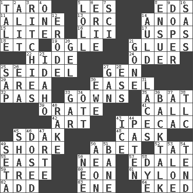 ACROSS 1. Edible starchy tuberous root 5. French article 8. Begley and Asner 11. Place in a line 13. The grampus (Milton) 14. Small Philippine buffalo 15. 61 cubic inches 16. Cards in a Roman deck? 17. United States Postal Service (abbr.) 18. And so on (abbr.) 19. Stare at amorously 21. Cements 22. Flintstone garb 24. Baltic tributary 25. Beer mug 27. Commissioned military rank (abbr.) 29. Length times width 30. Artist's stand 32. Romantic infatuation 33. Women's formal wear 35. Blind as ____ 39. Speak pompously 41. Give a ring to 42. Tate display 43. Medicinal drug used to evoke vomiting 45. Neighbor of Neb. 48. Keg 49. Dinah or Pauly 50. Collude with 52. Make lace 55. Compass direction 56. Teachers' org. 57. Peak District village in England 59. Family _ (genealogy) 60. Period of immesurable duration 61. High-strength synthetic material 62. Find the sum of 63. Compass dir. 64. Supplemented with great effort DOWN 1. Story 2. Came down and settled, as after flight 3. Actors Guy, Robert Welles, and Clint 4. Single 5. Hang loosely or laxly 6. 4th largest of the Great Lakes 7. _-fi 8. Follow as a consequence or result 9. Drug addict 10. Backtalk 12. Eat (away) 14. Old (Scot.) 20. Set 21. Went 23. Potato state 25. Plant excrement 26. Period 27. Separate the seeds from cotton 28. Double-curved letter 30. She-sheep 31. Shoestrings 33. Slender fish 34. Baseball player Mel 36. Sass 37. According to 38. Affectionate concern, for short 40. Immoral or dissolute person 43. Frozen water 44. Eucharist need 45. Pottery fragment 46. Administered medicine 47. Johnson of "Laugh-In" 49. Stalk of a moss capsule 50. Period of immesurable duration 51. Object of repulsion 53. Medicinal plant 54. Be inclined (to) 56. Born 58. Color