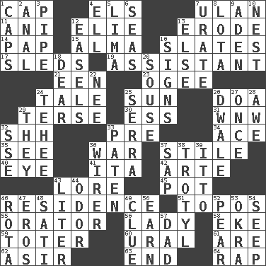 ACROSS 1. Head covering 4. Raised railways 7. ____ Bator, Mongolia 11. Cuckoo 12. Writer Wiesel 13. Wear away 14. Infant food 15. _ mater 16. Chalkboards 17. Bobsleighs 19. Helper 21. Car or cant ending 23. Double curve, resembling the letter S 24. Story 25. Player for Phoenix 26. ___ good deed 29. Laconic 30. Curvy letter 31. Compass dir. 32. Quiet! 33. Before (prefix) 34. Adept person 35. Perceive with the eye 36. Armed conflict 37. Vertical member of a panel or frame 40. Sight organ 41. Call ___ day 42. Johnson of "Laugh-In" 43. Old wives' tales, e.g. 45. Cooking vessel 46. Dwelling 51. Literary convention 55. Speaker 56. Kenny Rogers chart-topper in '80 58. Supplement with great effort 59. Carrier 60. Mountain range 61. "We ___ not amused" (Victoria) 62. SW Saudi Arabia district 63. Conclude 64. Strike DOWN 1. Smile enhancers 2. Of or related to the anus 3. Corncob 4. Pipe bend 5. Pale green bean 6. Oceans 7. A salt of uric acid 8. Globular water bottle used in Asia 9. An important port of Yemen 10. Egg locale 12. Artist's stands 13. Otherwise 16. Public displays of written messages 18. Letter starter 20. Boozer 22. Born 24. Giggle 25. Spanish missionary in California 26. A sleeping potion; an opiate (poet.) 27. Single time 28. Deep reverence 29. Those things 32. Compass dir. 33. Eucharist need 36. One who wires 37. Plant excrement 38. TNT 39. "Tell ____ the Marines!" 43. 61 cubic inches 44. Scent 46. Roll call or roster of names 47. Greek god of love 48. Suttee (variant) 49. A slight indication 50. Merit 52. Lightbulb-shaped fruit 53. Gumbo ingredient 54. Ooze 57. Male parent