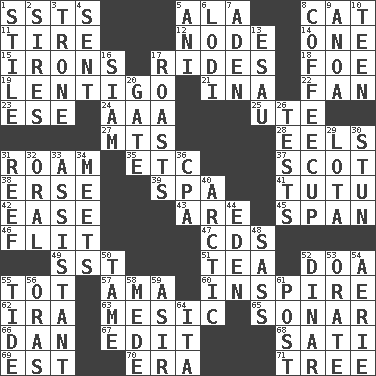ACROSS 1. Fast planes 5. Chicken ___ king 8. Feline 11. Hoop that covers a wheel 12. Connecting point 14. Single 15. Metal shackles 17. Amusement-park features 18. Enemy 19. Small, flat, pigmented spot on the skin 21. _ tizzy (2 wds.) 22. Avid follower 23. Compass dir. 24. Auto club (abbr.) 25. Shoshoni 27. Mountains (abbr.) 28. Snakelike fish 31. Wander aimlessly 35. And so on (abbr.) 37. Highlander 38. Celtic language 39. Health resort 41. Ballerina skirt 42. Relaxation 43. "We ___ not amused" (Victoria) 45. Connect, as a bridge 46. Sudden quick movement 47. Music discs 49. Fast jet (abbr.) 51. Afternoon social gathering 52. ___ good deed 55. Small child 57. Nursemaid (var.) 60. Stimulate to action 62. Lyricist Gershwin 63. Of or pertaining to a meson 65. Underwater navigation system 66. One of the 12 tribes of Israel 67. Prepare for publication 68. Suttee (variant) 69. Eastern Standard Time (abbr.) 70. Epoch 71. Family _ (genealogy) DOWN 1. Vertical member of a panel or frame 2. Male parents of animals 3. Marketplace scale 4. Emitted 5. Cuckoo 6. Farming town in central California 7. An important port of Yemen 8. Java holder (2 wds.) 9. Small Philippine buffalo 10. Adolescent 13. He sold his birthright 16. Thailand, formerly 17. Cooks with dry heat, as in an oven 20. Yard entry 26. Trials 29. Globular water bottle used in Asia 30. Astound 31. Coral collection 32. Relating to the mouth 33. Aide 34. Confronts 36. Numbers guy (abbr.) 40. Northern region 44. Locale of original sin 48. Backtalk 50. Not wild 52. Middle Eastern gold or silver currency 53. Declaim 54. Nest on high 55. Periodic rise and fall of the sea level 56. Mouths or openings 58. Ancient Persian 59. SW Saudi Arabia district 61. Mail 64. Call ___ day