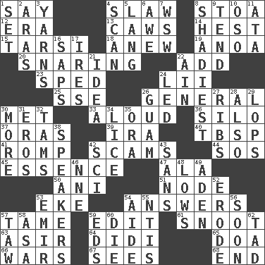 ACROSS 1. Declare 4. Cole _ (cabbage dish) 8. Portico 12. Period 13. Crow sounds 14. Behest 15. Tarsus (plural) 18. Afresh 19. Small Philippine buffalo 20. Catching in a trap 22. Say or write further 23. Moved rapidly 24. Cards in a Roman deck? 25. Compass dir. 26. Commissioned military rank 30. Was introduced to 33. Verbally 36. Grain storage tower 37. Mouths or openings 39. Retirement account (abbr.) 40. Cook's measure (abbr.) 41. Frolic 42. Fraudulent business schemes 44. Mayday 45. Gist 47. In the manner of 50. Cuckoo 51. Connecting point 53. Supplement with great effort 54. Replies (to) 57. Docile 59. Prepare for publication 61. Snout, nose 63. SW Saudi Arabia district 64. "You Light Up My Life" star Conn 65. ___ good deed 66. Armed conflicts 67. Observes 68. Conclude DOWN 1. Arrange properly for use 2. Ancient river in northeast Turkey 3. Entertaining tales 4. Examine hastily 5. Austrian-born American filmmaker Fritz 6. Deep reverence 7. Compass dir. 8. Most questionable 9. Look after 10. Bear (Spanish) 11. "One Day ___ Time" 16. Plant excrements 17. Angers 21. It may be bright or harebrained 22. The 18th letter of the Arabic alphabet 24. Directed 26. Island territory of the United States 27. Teases 28. In addition 29. Chops off 30. Greater amount 31. Greek god of love 32. Scottish caps 34. Louse (plural) 35. Mouth or opening 38. Orators 42. _-fi 43. Without 46. Compass dir. 48. Coldest temperatures 49. An important port of Yemen 52. Wear away 53. Arab leader 54. Assistant 55. Nuclear Threat Initiatives 56. Within a short period 57. The 23rd letter of the Hebrew alphabet 58. White ___ sheet 59. Begley and Asner 60. Pass on 62. Small boy