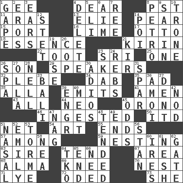 ACROSS 1. Turn to the right 4. Letter starter 8. Pacific Standard Time (abbr.) 11. Ancient river in northeast Turkey 13. Writer Wiesel 14. Lightbulb-shaped fruit 15. Sweet dark-red dessert wine 16. Welles in "The Third Man" 17. Von Bismarck 18. Core 21. Japanese brewing company 22. A blast of a horn 23. _ Lanka 25. Single 26. Boy, to dad 29. Orators 32. Cadet 34. Small moist lump or mass 35. Writing tablet 38. Silent film actress Nazimova 39. Gives off 41. So be it 43. Everything 44. Modern: prefix 45. U. of Maine site 46. Consumed 50. It would 51. Fish or hair follower 54. Nonscientific branch of learning 55. Extremities 57. Amid 59. Inhabiting a nest 63. The founder of a family 64. Look after 67. Type of rug 68. _ mater 69. Leg joint 70. Egg locale 71. Potassium hydroxide 72. Wrote a lyric poem 73. A female animal or person DOWN 1. Stare wonderingly 2. Greek god of love 3. Hearing organs 4. Erase 5. Biblical high priest 6. Direct toward a target or goal 7. To separate or throw off 8. Stone: prefix 9. Smooth fabric 10. Heavy duty weighing machine 12. Proofreading order 14. Luau course 19. Characteristic smell of wine 20. Police officer (slang) 21. Apertif with cassis 23. Three-handed card game 24. Confederate soldiers (slang) 26. Health resort 27. Water jar 28. 1994 drama film starring Jodie Foster 30. Goodbye (Sp.) 31. Coast Guard woman 33. Indonesian resort city 36. Mine, in Marseilles 37. Incision 39. Engineer (abbr.) 40. Confront 42. Dreamland 45. Likelihood 47. Tired old horse 48. Watched over 49. Compass dir. 51. Relating to the nose 52. Poet Dickinson 53. Singer Mel 56. Comedian Laurel of Laurel & Hardy 58. Teachers' org. 60. Angers 61. Tender 62. Yard entry 64. Ring climax 65. Conclusion 66. Born