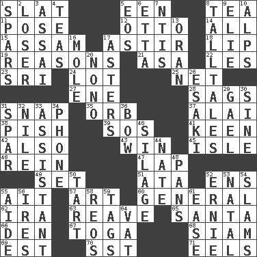 ACROSS 1. Narrow board 5. Car or cant ending 8. Afternoon social gathering 11. Introduce or present, as a question 12. "Beetle Bailey" pooch 14. 100% 15. Indian state 17. Moving about 18. Mouth edge 19. Thinks logically 21. White ___ sheet 22. French article 23. Indian title of respect (Mr.) 24. Car dealer's back yard 25. Fish or hair follower 27. Compass dir. 28. Settles 31. Fastener 35. Globe 37. Jai _ 38. Expression of disdain 39. Mayday 41. Peachy ____! 42. In addition 43. Acquire through effort 45. Capri or Wright 46. It's straight from the horse's mouth 47. Pet locale 49. Arrange properly for use 51. _ moment's notice (2 wds.) 52. Followers of ems 55. Small island 57. Tate display 60. Commissioned military rank 62. Retirement account (abbr.) 63. Break or tear apart 65. Before Barbara or Clara 66. Lair 67. Ancient Roman robe 68. Thailand, formerly 69. Eastern Standard Time (abbr.) 70. Fast jet (abbr.) 71. Snakelike fish DOWN 1. Practice fights 2. Failure 3. Slender Brazilian palm 4. Afternoon social gatherings 5. Greek goddess of the dawn 6. Singer James 7. Nuclear Threat Initiatives 8. Baron Munchausen's specialties 9. Writer Wiesel 10. High mountains 13. Northwest Algerian city 16. Undercover agent 17. Michaelmas daisies 20. Words to Nanette 26. 1973 Nobel Price Winner (Physics) Leo 29. Highlander 30. Trig term 31. Practice fight 32. "Death on the ____" 33. Aide 34. Give a jingle 36. Ribbon knot 40. Fodder prepared in a silo 44. Nathan's nickname 48. Zero-star reviews 50. Small pie 52. Bert's buddy 53. Brizilian seaport 54. Shuts with force 55. Assistant 56. Angers 58. Vintage cars 59. Labels 61. Comfort 64. Large container