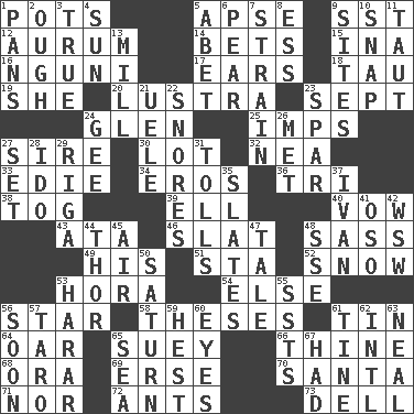 ACROSS 1. Cooking vessels 5. Domed church section 9. Fast jet (abbr.) 12. Gold (Symbol: Au) 14. Wagers 15. _ tizzy (2 wds.) 16. Group of southern Bantu languages 17. Hearing organs 18. The 19th letter of the Greek alphabet 19. A female animal or person 20. A period of five years 23. Back-to-school mo. 24. Small, secluded valley 25. Naughty children 27. Male parent of an animal 30. Car dealer's back yard 32. Teachers' org. 33. Singer Brickell 34. Greek god of love 36. Three (prefix) 38. Coat; cloak 39. Pipe bend 40. Promise 43. _ moment's notice (2 wds.) 46. Narrow board 48. Backtalk 49. Part of HMS, perhaps 51. R.R. building 52. Frozen precipitation 53. Israeli folk dance 54. Otherwise 56. Play the lead 58. College papers 61. Metal container 64. Rowing implement 65. Chop _ 66. One or ones belonging to thee 68. Mouth or opening 69. Celtic language 70. Before Barbara or Clara 71. Or not 72. Pismires 73. Small valley DOWN 1. Baking dishes 2. Ending for "Through" and "Enough" 3. Loyal 4. Player for Phoenix 5. Collude with 6. Lightbulb-shaped fruit 7. Put through a sieve 8. Curvy letter 9. Locates 10. Fastener 11. Strained 13. Place where flour is made 21. Ubangi River tributary 22. Sounds asleep 23. Practice fight 24. Unit of force equal to gravity 26. Was introduced to 27. Put into a specified state 28. Wedding promise 29. Capital of Latvia 31. For Whom the Bell _____ 35. Chalkboards 37. _ the terrible 41. Bear (Spanish) 42. Compass dir. 44. Son of Odin 45. Wind 47. Falsehood 48. Compass dir. 50. Titan orbits this 53. Ethiopian city, capital of Harari 55. Fast planes 56. Within a short period 57. Pacific island yam 59. Behest 60. Sight organs 61. Prong on a fork 62. International (abbr.) 63. Anneal 65. Ocean 67. Possessed