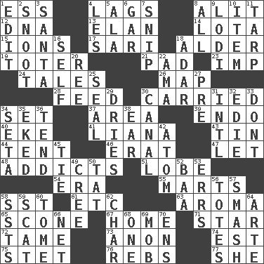 ACROSS 1. Double-curved letter 4. Straggles 8. Set down 12. Heredity factor (abbr.) 13. Liveliness 14. Globular water bottle used in Asia 15. Charged particles 17. Indian skirt 18. Tree or shrub in the Birch family 19. Carrier 21. Writing tablet 23. Naughty child 24. Stories 26. Atlas unit 28. Nourish 30. Borne 34. Arrange properly for use 37. Type of rug 39. Inside; within (prefix) 40. Supplement with great effort 41. Woody, climbing, usually tropical plant 43. Shallow baking pan 44. Portable shelter 46. Part of Q.E.F. 47. Allow 48. Inveterate users 51. Ear part 54. Period 55. Shops 58. Fast jet (abbr.) 61. And so on (abbr.) 63. Odor 65. Biscuitlike quick bread 67. Residence 71. Play the lead 72. Not wild 73. At once, immediately (arch.) 74. Eastern Standard Time (abbr.) 75. Proofreading order 76. Confederate soldiers (slang) 77. A female animal or person DOWN 1. Prepare for publication 2. Snout, nose 3. Before Barbara or Clara 4. French article 5. According to 6. Slender fish 7. Clip 8. Everything 9. Farming town in central California 10. A whole individual unit 11. Canvas cover 16. Oneself 18. The sixth month of the Jewish calendar 20. To sift 22. Wet nurse (var.) 25. Lick closed 27. Before (prefix) 29. Frees from moisture 30. Lessep's creation 31. International (abbr.) 32. Singer Brickell 33. Do not 34. Stalk of a moss capsule 35. Supplemented with great effort 36. Watch over 38. Ewer handle 42. Smallest unit of an element 45. Make a knot 49. Algonquian 50. Make lace 52. Sound made by sheep 53. Blunders 56. Hauls 57. Box-office sellout 58. Fast planes 59. Jazz singing style 60. Heavy book 62. Burn to charcoal 64. Johnson of "Laugh-In" 66. Fish or hair follower 68. Single 69. Disorderly crowd 70. Followers of ems