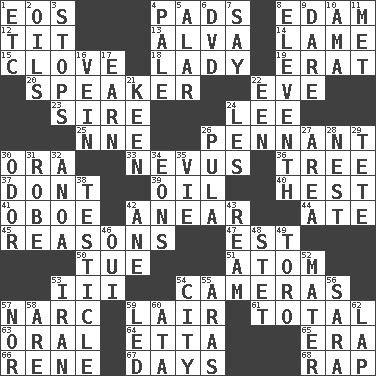 ACROSS 1. Greek goddess of the dawn 4. Groovy apts. 8. Dutch treat 12. Teat (slang) 13. Inventor's middle name 14. Unable to walk 15. Garlic unit 18. Kenny Rogers chart-topper in '80 19. Part of Q.E.F. 20. Orator 22. First lady 23. The founder of a family 24. Area sheltered from the wind 25. Compass dir. 26. Pre-World Series prize 30. Mouth or opening 33. Congenital growth or mark on the skin 36. Woody plant 37. Do not 39. Lubricate 40. Command 41. Mitch Miller's instrument 42. Approach 44. Had dinner 45. Thinks logically 47. Eastern Standard Time (abbr.) 50. Third day of the wk. 51. Tiny particle 53. One more than two 54. Devices for capturing images 57. Drug cop 59. Den 61. "_____ Recall" 63. Spoken 64. Singer James 65. Period 66. French philosopher Descartes 67. 24-hour periods 68. Strike DOWN 1. And so on (abbr.) 2. Petroleums 3. Halts 4. Light colored 5. Having or resembling wings 6. Movie disc 7. Declare 8. Veterans Day date 9. Have the gumption 10. Housemaid (var.) 11. Was introduced to 16. Distinctive style or manner 17. Merit 21. Peachy ____! 22. Car or cant ending 24. French article 26. Monetary unit of Botswana 27. Length times width 28. Egg locale 29. False hair 30. Aroma 31. Loose flowing garment 32. Small Philippine buffalo 34. Immeasurably long periods of time 35. Compete 38. A testis 42. A saturated hydrocarbon 43. 480, 500 or 516 sheets of paper 46. Fr. "Yes" 48. Proofreading order 49. "Corrida" creature 52. Mother 53. SW Asia republic 54. Municipality 55. Ancient river in northeast Turkey 56. "Two Mules for Sister ____" 57. Or not 58. "We ___ not amused" (Victoria) 59. Directed 60. _ moment's notice (2 wds.) 62. Infant locale
