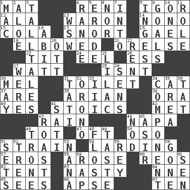 ACROSS 1. Floor covering 4. Painter Guido (1575-1642) 8. Russian composer Stravinsky 12. Chicken ___ king 13. Make _____ (do battle with) 14. Words to Nanette 15. Root beer relative 17. Derisive sound 18. Highlander 19. Shoved, as through a crowd 21. Threatening words 23. Teat (slang) 24. Snakelike fish 26. Double-curved letter 27. Electrical Unit 28. Is not 30. Cartoonist voice _ Blanc 31. Bathroom 34. Domesticated feline 37. "We ___ not amused" (Victoria) 38. Believer in; advocate of (suffix) 39. Mouth or opening 40. Consenting reply 41. Unemotional ones 42. Was introduced to 43. Water falling in drops from the sky 44. California wine valley 46. Small child 47. Often (poetically) 50. Bear (Spanish) 51. Put through a sieve 54. Preparing or cooking with lard 57. Greek god of love 58. Came up 60. Vintage cars 62. Portable shelter 63. Thoroughly unpleasant 64. Compass dir. 65. Observes 66. Domed church section 67. "___ Little Indians" DOWN 1. Big _ 2. Medicinal plant 3. Baron Munchausen's specialties 4. The wife of a rajah (variant) 5. Eat (away) 6. Or not 7. To the inside or interior of 8. Swallow 9. Purposes of endeavors 10. Washington bills 11. Hero or heavy, e.g. 13. Compass dir. 16. "This won't hurt ____!" 20. Baseball player Mel 22. Monthly bill 25. Pale purple color 27. We are 29. Elected reps. 30. Can I? 31. Jacques of French films 32. U. of Maine site 33. One more than two 34. Part 35. Length times width 36. Make lace 41. Suttee (variant) 43. Ridicules or criticizes harshly 44. Allow head to fall sleepily 45. SW Saudi Arabia district 46. Heavy duty weighing machine 48. Soft thread for cleaning between teeth 49. Clothes sense 51. Puts into a specified state 52. Family _ (genealogy) 53. Nanny 55. Marina Del _, California 56. Went 59. Strike 61. Elected rep.