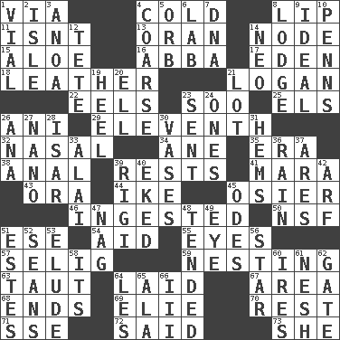 ACROSS 1. By way of 4. Chilled 8. Mouth edge 11. Is not 13. NW Algerian seaport 14. Connecting point 15. Medicinal plant 16. Swedish rock group 17. Locale of original sin 18. Cordwainer's material 21. Utah city north of Ogden 22. Snakelike fish 23. "Barney Miller" actor Jack 25. Raised railways 26. Cuckoo 29. Veterans Day date 32. Relating to the nose 34. One (Scot) 35. Epoch 38. Of or related to the anus 39. Musical pauses 41. Hindu Mythology: god of death 43. Mouth or opening 44. Eisenhower's nickname 45. Flexible twig of a willow tree 46. Consumed 50. Science/research agcy. 51. Compass dir. 54. Help 55. Sight organs 57. Major League Baseball Commissioner Bud 59. Snuggling 63. Tense 64. Put down 67. Type of rug 68. Extremities 69. Writer Wiesel 70. Take ten 71. Compass dir. 72. Expressed in words 73. A female animal or person DOWN 1. Small bottle 2. Capri or Wright 3. Small Philippine buffalo 4. Unrefined 5. Globe 6. Experiment locale 7. Heredity factor (abbr.) 8. Cabin 9. Perfect 10. Actor Sean's family 12. Wig 14. Modern: prefix 19. Person who is morally reprehensible 20. Pipe bend 21. Car dealer's back yard 23. Emitted 24. Washington bills 26. Santa ___, CA 27. Billionth: prefix 28. Austrian river, tributary to the Danube 30. Flower holders 31. Equivocates 33. Jai _ 36. Precipitation 37. Ancient Greek god of war 39. Swiss mountan, "Queen of the Mountains" 40. Supplemented with great effort 42. Sandy's bark 45. Lyric poems 47. Tired old horse 48. Looked after 49. Sight organ 51. _____ Park, CO 52. Seines 53. Evade 56. Play the lead 58. ___ a Wonderful Life 60. Angers 61. Tender 62. Yard entry 64. French article 65. Chicken ___ king 66. One more than two