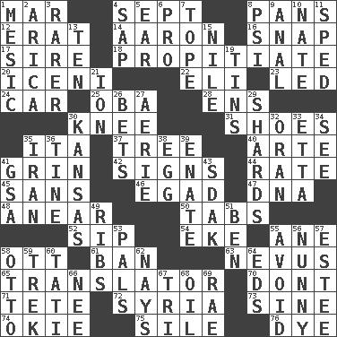 ACROSS 1. Spoil 4. Back-to-school mo. 8. Baking dishes 12. Part of Q.E.F. 14. Composer Copland 16. Fastener 17. Title for a man of rank and authority 18. Appease 20. Ancient Celtic tribe of eastern Britain 22. Biblical high priest 23. Directed 24. Automobile 25. Chief or king in Benin or Nigeria 28. Followers of ems 30. Leg joint 31. Imelda's hoard 35. Call ___ day 37. Woody plant 40. Johnson of "Laugh-In" 41. Amused look 42. Signals 44. Assign a rank or rating to 45. Without 46. Mild oath 47. Heredity factor (abbr.) 48. Approach 50. Bar bills 52. Small drink 54. Supplement with great effort 55. A saturated hydrocarbon 58. Baseball player Mel 61. Bar 63. Mole, birthmark 65. Interpreter 70. Do not 71. Wig 72. Damascus' land 73. Trig term 74. Migrant worker of the '30s 75. Filth; sediment 76. Color DOWN 1. Mesonic 2. N. Chile seaport 3. Less widely known 4. Plant excrement 5. Ewer handle 6. Adept person 7. Drink excessively 8. 23rd letter of the Greek alphabet 9. Of or related to the anus 10. Nathan's nickname 11. Drove too fast 13. Nine, plus one 15. "Death on the ____" 19. Metal containers 21. Electrically charged atom 26. Antes 27. Nest on high 29. Broken pieces 30. Sunflower state 32. NW Algerian seaport 33. Singer James 34. Observe 35. SW Asia republic 36. Prong on a fork 38. Oval reproductive body of a fowl 39. Maternal 41. Girls' org. (abbr.) 43. Neighbor of Neb. 49. Teases 51. Benjamin's nick name 53. Friends 55. Stay clear from 56. Pet term 57. First name in cosmetics 58. Von Bismarck 59. Long journey 60. Jacques of French films 62. Negative votes 64. Begley and Asner 66. Born 67. Three (prefix) 68. Lubricate 69. Actress Charlotte