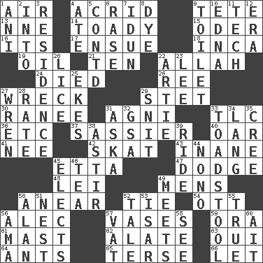 ACROSS 1. Wind 4. Bitter 9. False hair 13. Compass dir. 14. Sycophant 15. Baltic tributary 16. ___ a Wonderful Life 17. Take place subsequently 18. South American Indian 19. Lubricate 21. Nine, plus one 22. Assad's deity 24. Passed on 26. Portuguese money of account (variant) 27. Raze 29. Proofreading order 30. The wife of a rajah (variant) 31. Hindu god of fire 33. Affectionate concern, for short 36. And so on (abbr.) 37. More impudent 40. Boat paddle 41. Born 42. Three-handed card game 43. Empty; void 45. Singer James 47. Evade 48. Luau accessory 49. Not women's 50. Approach 52. Standoff 54. Baseball player Mel 56. Actor Baldwin 57. Flower holders 59. Mouth or opening 61. Vertical spar for supporting sails 62. Having winglike extensions 63. Fr. "Yes" 64. Pismires 65. Laconic 66. Allow DOWN 1. Black tropical American cuckoo 2. To the inside or interior of 3. Dwelling 4. Had dinner 5. Continued (abbr.) 6. Raze (variant) 7. Goddess of spring and wife of Bragi 8. Color 9. Rest room 10. Pulitzer Prize-winning author Ferber 11. Georgia ____ (Atlanta school) 12. Epoch 20. Louse (plural) 22. Nick name for Arthur 23. Area sheltered from the wind 25. Makes supply last 27. Songbird 28. Assign a rank or rating to 29. In a ____ (agitated or irritated) 31. "____ silly question..." 32. Girls' org. (abbr.) 33. Inedible or poisonous agaric 34. Long (Scottish) 35. Algonquian 38. Being in motion 39. Travel on an animal 44. Words to Nanette 45. Chooses 46. Afternoon social gathering 49. Confronts 50. ____ Jay Lerner 51. Egg locale 52. Falsehood 53. Austrian river, tributary to the Danube 55. Loyal 56. Nursemaid (var.) 57. Large container 58. Perceive with the eye 60. Small island