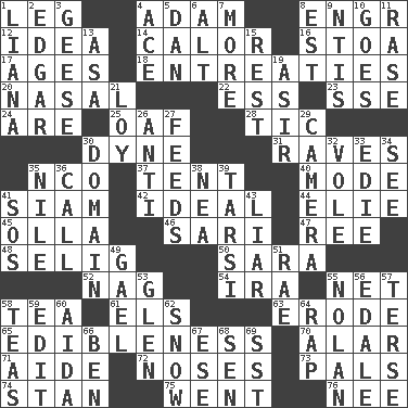 ACROSS 1. Part of a journey 4. First of billions? 8. Engineer (abbr.) 12. The main thing one is thinking about 14. Bodily heat indicating an inflammation 16. Portico 17. Eras 18. Pleas 20. Rhinal 22. Double-curved letter 23. Compass dir. 24. "We ___ not amused" (Victoria) 25. Clumsy lout 28. Nervous spasm 30. Centimeter-gram-second unit of force 31. All-night dance parties 35. Non-commissioned officer (abbr.) 37. Portable shelter 40. Method 41. Thailand, formerly 42. Perfect 44. Writer Wiesel 45. Spanish pot 46. Indian skirt 47. To separate or throw off 48. Former Milwaukee Brewers owner Bud 50. "Two Mules for Sister ____" 52. Tired old horse 54. Retirement account (abbr.) 55. Fish or hair follower 58. Beverage made from leaves 61. Raised railways 63. Wear away 65. The property of being fit to eat 70. Having or resembling wings 71. Assistant 72. Olfactory organs 73. Friends 74. Comedian Laurel of Laurel & Hardy 75. Left 76. Born DOWN 1. Climbing, woody, usually tropical vines 2. _ Allan Poe 3. Honkers 4. Adept person 5. Daniel's nick name 6. Keyboard modifier key 7. Greater amount 8. Eastern Standard Time (abbr.) 9. Nuclear Threat Initiatives 10. Leaves 11. Raze (variant) 13. White ___ sheet 15. Take ten 19. SW Saudi Arabia district 21. Myrna of the movies 26. Against 27. Eats 29. Device for capturing images 30. Kingdom 32. Short-tailed, large-bodied rat 33. Singer Brickell 34. Perceive with the eye 35. "Death on the ____" 36. Give a ring to 38. Teachers' org. 39. Tarsus (plural) 41. Distress signal 43. One who doesn't tell the truth 49. Highlander 51. Actress Charlotte 53. Small, secluded valley 55. Pitcher Ryan 56. Peak District village in England 57. Laconic 58. Beverages made from leaves 59. Prepare for publication 60. Opera by Verdi 62. Frozen precipitation 64. Hit sharply and swiftly 66. Benjamin's nick name 67. Compass dir. 68. Elected rep. 69. Fast jet (abbr.)