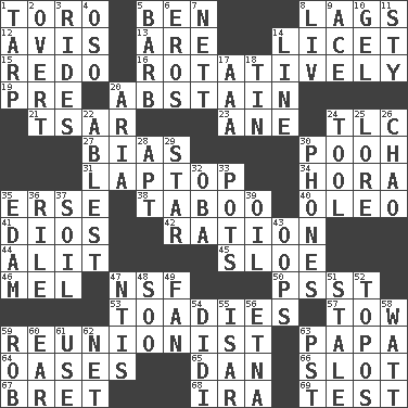 ACROSS 1. "Corrida" creature 5. Benjamin's nick name 8. Fails to keep up a pace 12. Opinion 13. "We ___ not amused" (Victoria) 14. It is permitted: Lat. 15. Make new 16. Producing rotation 19. Before (prefix) 20. Choose not to consume 21. Russian ruler of old 23. One (Scot) 24. Affectionate concern, for short 27. Prejudice 30. "Silly old bear" 31. Portable computer 34. Israeli folk dance 35. Celtic language 38. Off limits 40. Butter sub 41. "Vaya con ____" 42. Food allowance for one day 44. Came down and settled, as after flight 45. A type of plum 46. Cartoonist voice _ Blanc 47. Science/research agcy. 50. Inconspicuous attention getter 53. Sycophants 57. Pull behind 59. One who advocates reunion 63. Dad 64. Fertile tracts in a desert 65. One of the 12 tribes of Israel 66. Narrow opening 67. Cy Young winner Saberhagen 68. Lyricist Gershwin 69. Trial DOWN 1. Canvas cover 2. Unconcealed 3. Amusement-park features 4. Bear (Spanish) 5. Sharp remark 6. Greek god of love 7. Remaining after all deductions 8. 54 in ancient Rome 9. Adept person 10. Set 11. Filthy place 14. Actor's bit 17. Auto club (abbr.) 18. Metal container 20. Operatic vocal solo 22. Most capable 24. Instrument 25. Old wives' tales, e.g. 26. US Secretary of Labor Elaine L. _ 28. Fitting 29. Play the lead 30. Gives a jingle 32. Chief or king in Benin or Nigeria 33. Cooking vessels 35. Dutch treat 36. Cause heat under the collar 37. Earth 39. Lubricate 43. I made a mistake 47. Nuclear Threat Initiatives 48. "Barney Miller" actor Jack 49. Air blower 51. Lacking originality or spontaneity 52. Literary convention 54. "You Light Up My Life" star Conn 55. Austrian river, tributary to the Danube 56. Inactive volcano in Sicily 58. Electrical Unit 59. Director Reiner 60. Hearing organ 61. Purpose 62. Fish or hair follower 63. Pacific Standard Time (abbr.)