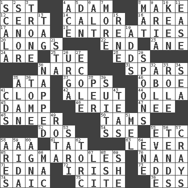 ACROSS 1. Fast jet (abbr.) 4. First of billions? 8. Cause to be 12. Certainty 14. Bodily heat indicating an inflammation 16. Length times width 17. Small Philippine buffalo 18. Pleas 20. Yearns 22. Conclude 23. A saturated hydrocarbon 24. "We ___ not amused" (Victoria) 25. Third day of the wk. 28. Begley and Asner 30. Drug cop 31. Practice fights 35. _ moment's notice (2 wds.) 37. Republicans 40. Mitch Miller's instrument 41. Hoof sound 42. Eskimo relative 44. Rounded earthenware pot or jar 45. Moist 46. 4th largest of the Great Lakes 47. Born 48. Contemptuous expression 50. Scottish caps 52. Two (Sp.) 54. Compass dir. 55. And so on (abbr.) 58. American Automobile Association (abbr.) 61. Make lace 63. Prying instrument 65. Frustrating wastes of time 70. Nanny 71. Pulitzer Prize-winning author Ferber 72. From or relating to Ireland 73. Whirlpool 74. Ketch in the Levant 75. Quote 76. Curvy letter DOWN 1. Any of the three canals of the cochlea 2. Sir (Sp.) 3. Marketplace scale 4. Adept person 5. One of the 12 tribes of Israel 6. Keyboard modifier key 7. Greater amount 8. Floor protector 9. Operatic vocal solo 10. Peachy ____! 11. Comfort 13. Label 15. French philosopher Descartes 19. Does sums 21. R.R. building 26. Capital and largest city of Mongolia 27. Learning spot: Fr. 29. Soup utensils 30. Slept 32. Competent 33. Hero or heavy, e.g. 34. Ocean 35. Actor Alda or Thicke 36. Heavy book 38. For each 39. Sets of matching outer garments 41. Music discs 43. Afternoon social gatherings 49. Roll call or roster of names 51. Cartoonist voice _ Blanc 53. Indian skirt 55. Dodge 56. Watches over 57. Trading vessels 58. Ancient Greek god of war 59. Opera by Verdi 60. Hindu god of fire 62. Torque (variant) 64. Compass dir. 66. Apple computer (short form) 67. Cards in a Roman deck? 68. Eastern Standard Time (abbr.) 69. A female animal or person