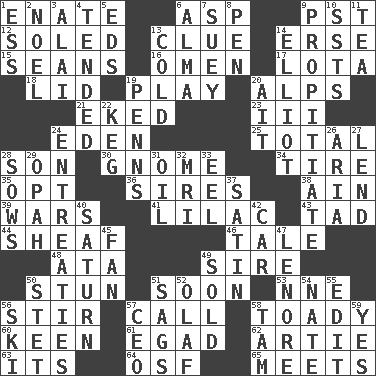 ACROSS 1. Maternal 6. Cleo's killer 9. Pacific Standard Time (abbr.) 12. Having a sole or soles 13. A slight indication 14. Celtic language 15. Actors Connery and Penn 16. Sign of things to come 17. Globular water bottle used in Asia 18. Hat (slang) 19. Live dramatic performance 20. High mountains 21. Made supply last 23. One more than two 24. Locale of original sin 25. Add up to 28. Male child 30. Dwarf 34. Hoop that covers a wheel 35. Choose 36. Begets 38. The 18th letter of the Arabic alphabet 39. Armed conflicts 41. Pale purple color 43. Small boy 44. To gather and bind into a bundle 46. Lie 48. "One Day ___ Time" 49. Male parent of an animal 50. Surprise greatly 51. Within a short period 53. Compass dir. 56. Move through with a circular motion 57. Give a ring to 58. Sycophant 60. Peachy ____! 61. Mild oath 62. Nick name for Arthur 63. ___ a Wonderful Life 64. Order of Saint Francis (abbr.) 65. Confronts DOWN 1. Double-curved letter 2. Christmas carol 3. Jai _ 4. Looked after 5. Begley and Asner 6. _ mater 7. Chop _ 8. Fenced enclosure 9. Appease 10. Fast planes 11. Beverage made from leaves 13. Having a low temperature 14. American author Paul (1891-1958) 19. Actor Sean's family 20. Small island 22. Barrel 24. Pleas 26. Operatic vocal solo 27. Grant temporary use of 28. Sty mamas 29. Brightly colored fish 31. Petroleum 32. Medical imaging device (abbr.) 33. Snakelike fish 37. Smooth fabric 40. Titan orbits this 42. 4-wheeled motor vehicle 45. Avid follower 47. Poe poem 49. Exchanged or delivered for money 50. Proofreading order 51. Settles 52. Norwegian king 54. Nathan's nickname 55. Prepare for publication 56. What Jean-Claude Killy likes to do 57. Corporate head (abbr.) 58. Scottish cap 59. It is so