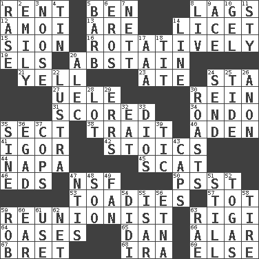 ACROSS 1. Monthly bill 5. Benjamin's nick name 8. Fails to keep up a pace 12. Mine, in Marseilles 13. "We ___ not amused" (Victoria) 14. It is permitted: Lat. 15. The Jewish people; Israel 16. Producing rotation 19. Raised railways 20. Choose not to consume 21. Shout 23. Had dinner 24. R.R. building 27. Ubangi River tributary 30. It's straight from the horse's mouth 31. Tallied 34. Southwest Nigerian state 35. Religious group 38. Distinguishing feature 40. Arabian gulf 41. Russian composer Stravinsky 42. Unemotional ones 44. California wine valley 45. Get outta here! 46. Begley and Asner 47. Science/research agcy. 50. Inconspicuous attention getter 53. Sycophants 57. Small child 59. One who advocates reunion 63. Swiss mountan, "Queen of the Mountains" 64. Fertile tracts in a desert 65. Daniel's nick name 66. Having or resembling wings 67. Cy Young winner Saberhagen 68. Retirement account (abbr.) 69. Otherwise DOWN 1. Raze (variant) 2. Poet Dickinson 3. Trap for birds or small mammals 4. Metal container 5. Sharp remark 6. Greek god of love 7. Remaining after all deductions 8. 54 in ancient Rome 9. Adept person 10. Set 11. Filthy place 14. Actor's bit 17. Auto club (abbr.) 18. Teat (slang) 20. Actor Baldwin 22. A period of five years 24. Post 25. Event that recurs at intervals 26. Soon (poet.) 28. Car dealer's back yard 29. Blunders 30. Cooks with dry heat, as in an oven 32. Erode 33. "Vaya con ____" 35. Trig term 36. Mild oath 37. 911 reaches them 39. Nervous spasm 43. Smile enhancers 47. Nuclear Threat Initiatives 48. "Barney Miller" actor Jack 49. Air blower 51. Free from disturbance or agitation 52. Ancient Roman robes 54. "You Light Up My Life" star Conn 55. Austrian river, tributary to the Danube 56. Inactive volcano in Sicily 58. Become fatigued 59. Director Reiner 60. Ewer handle 61. Purpose 62. Fish or hair follower 63. Actress Charlotte
