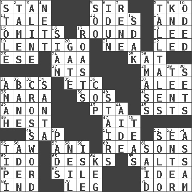 ACROSS 1. Comedian Laurel of Laurel & Hardy 5. Title for a knight 8. Ring climax 11. Falsehood 12. Lyric poems 14. Plus 15. Leaves out 17. Unit of ammunition 18. Area sheltered from the wind 19. Small, flat, pigmented spot on the skin 21. Teachers' org. 22. Directed 23. Compass dir. 24. Auto club (abbr.) 25. Krazy ___ of comics 27. Mountains (abbr.) 28. Floor protectors 31. Lettered men learn these first 35. And so on (abbr.) 37. Toward shelter 38. Hindu Mythology: god of death 39. Distress signal 41. Transmitted 42. At once, immediately (arch.) 43. Parent Teacher Association (abbr.) 45. Fast planes 46. Command 47. Small island 49. Plant excrement 51. Binary compound 52. Ocean 55. The 23rd letter of the Hebrew alphabet 57. Cuckoo 60. Thinks logically 62. Wedding promise 63. Writing tables 65. Table seasonings 66. For each 67. Drop; flow; fall 68. The content of cognition 69. Working for oneself (abbr.) 70. Part of a journey 71. Dormintory (informal) DOWN 1. Fur scarf 2. Domesticates 3. Place in a line 4. Remaining after all deductions 5. "Barney Miller" actor Jack 6. Goddess of spring and wife of Bragi 7. French philosopher Descartes 8. Baron Munchausen's specialties 9. Leg joint 10. Wrote a lyric poem 13. Neighbor of Neb. 16. Thailand, formerly 17. Ridicules or criticizes harshly 20. Yard entry 26. Collect or gather 29. Portable shelter 30. Puts into a specified state 31. Nursemaid 32. Object of repulsion 33. What you're doing now 34. Before Barbara or Clara 36. Police officer (slang) 40. Flight of steps 44. Helper 48. Afternoon social gatherings 50. Groovy apts. 52. Twentieth part of a lira 53. Keyboard key 54. Indian state 55. Native american tent (variation) 56. Arabian gulf 58. Famous astronaut Armstrong 59. Small island 61. Expressed in words 64. Cask