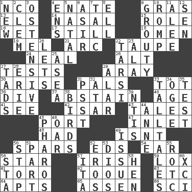 ACROSS 1. Non-commissioned officer (abbr.) 4. Maternal 9. Pate de foie ____ 13. Raised railways 14. Rhinal 15. Hero or heavy, e.g. 16. Soggy 17. Free from disturbance or agitation 18. Presage 19. Cartoonist voice _ Blanc 21. Curve 22. Grayish beige 24. Actress Patricia 26. The first octave above the treble staff 27. Trials 29. Like ___ of sunshine 30. Get up 31. Friends 33. Small child 36. HTML Container Element 37. Choose not to consume 40. Ripen 41. Observe 42. Austrian river, tributary to the Danube 43. Falsehoods 45. Left side of a ship or aircraft 47. An arm off of a larger body of water 48. Possessed 49. Is not 50. Practice fights 52. Begley and Asner 54. Hearing organ 56. Play the lead 57. From or relating to Ireland 59. Brine-cured salmon 61. "Corrida" creature 62. Woman's close-fitting hat 63. And so on (abbr.) 64. Flats, for short 65. NE Netherlands city 66. _-fi DOWN 1. ___ Haven, CT 2. Clement's nick name 3. Clearly or manifestly demonstrative 4. Followers of ems 5. Brizilian seaport 6. SW Saudi Arabia district 7. Baby powder 8. Pipe bend 9. Sullen 10. Play 11. Toward shelter 12. Elected rep. 20. Allows 22. Tarsus (plural) 23. Insect wing 25. At sea 27. Small boys 28. 4th largest of the Great Lakes 29. Having or resembling wings 31. Inconspicuous attention getter 32. _ moment's notice (2 wds.) 33. Baron Munchausen's specialties 34. Double curve, resembling the letter S 35. Trial 38. Avian creatures 39. Nuclear Threat Initiatives 44. Singer Murray 45. N Egypt peninsula 46. Rowing implement 49. Come out of 50. Obstruct or block passage 51. Role in a play 52. Greek god of love 53. "Vaya con ____" 55. College mil. group 56. R.R. building 57. Call ___ day 58. Layer 60. One more than ninety
